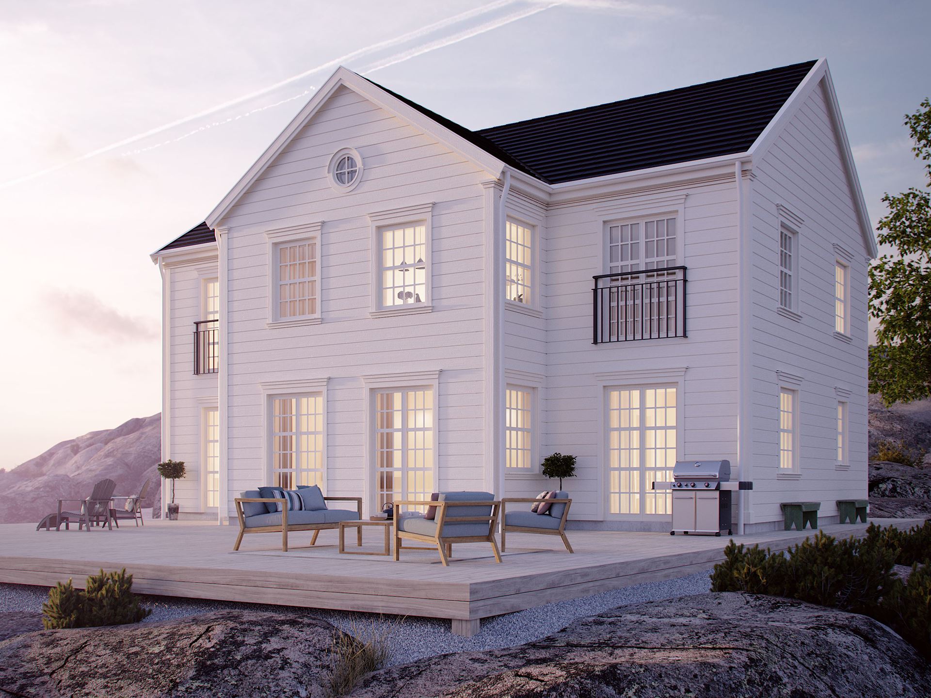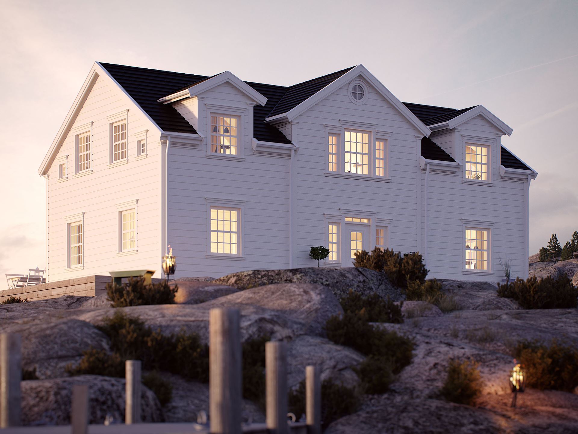 Ett New England-hus får karaktär genom sin utformning. Det handlar om att ge huset ett resligt, ståtligt intryck med vackra kontraster. Tidigare har svart mot vitt varit den mest populära färgsättningen, men ett kritvitt hus är inte alltid helt enkelt att passa in i sin omgivning. Därför väljer vi gärna en annan ljus fasadkulör ihop med vita fönster och foder till våra New England-hus. Det ger husen en lite mjukare framtoning, vilket både ligger väl i tiden och passar fler olika miljöer. Men på rätt hus och på rätt plats är en vit fasad hur snyggt som helst. Är det just ett sådant hus du drömmer om är det självklart ett sådant du ska ha. Det är du som sätter stilen.
