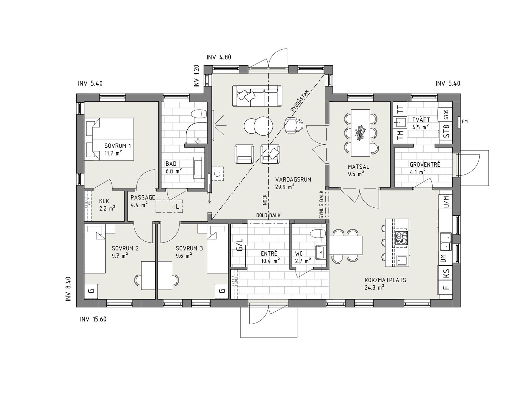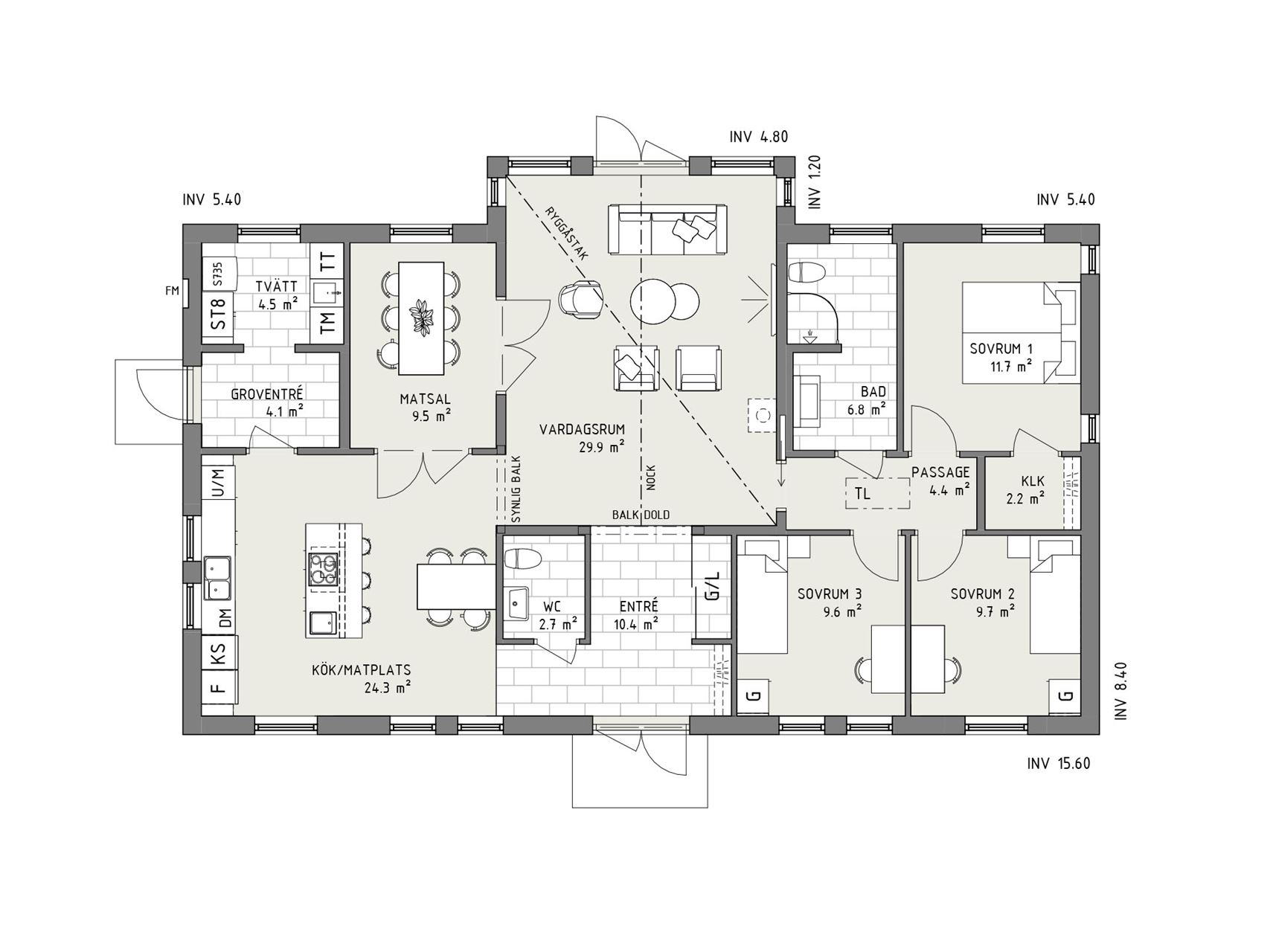 Redan i entrén välkomnas du av ljuset från vardagsrummets stora fönsterytor som lockar dig rakt in i hemmets sociala härlighet. Vardagsrumsdelen visar upp en härlig rymd, och här finns även utgång till uteplats och trädgård. Lagom mycket vid sidan av väntar ett luftigt kök med plats för matplats och ingång till tvättstugan med groventré. Bredvid den finns ett extra rum som både kan användas som matsal, gästrum – eller kanske ditt hemmakontor?