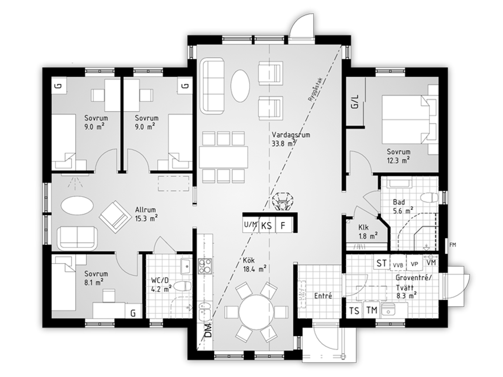Ungdomsavdelningen ligger avskild och har både eget allrum och toalett. Sovrummet för föräldrarna ligger på säkert avstånd många kvadrat därifrån. Mamma och pappa har eget badrum med möjlighet att ha hörnbadkar. Huset har god genomsikt och de stora glaspartierna mot trädgården gör ute till inne.