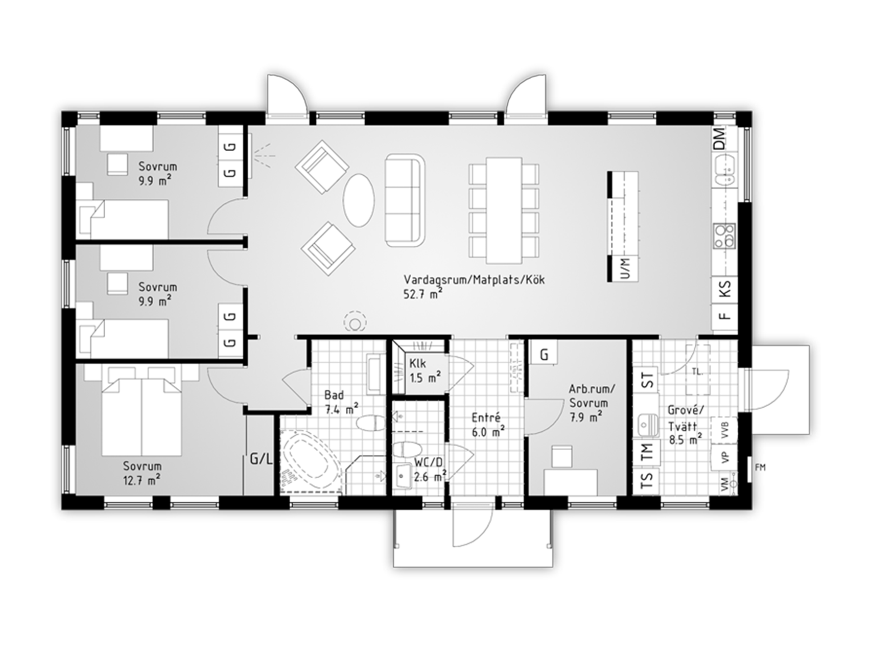 Köket går att få mer avskilt med en fondvägg, eller mer i direkt kontakt med vardagsrummet genom en bardel. De stora fönsterpartierna i huset ger en känsla av att trädgården tillhör inredningen. Önskar du en mer privat del med sovrum och allrum går det att dela av vardagsrummet.