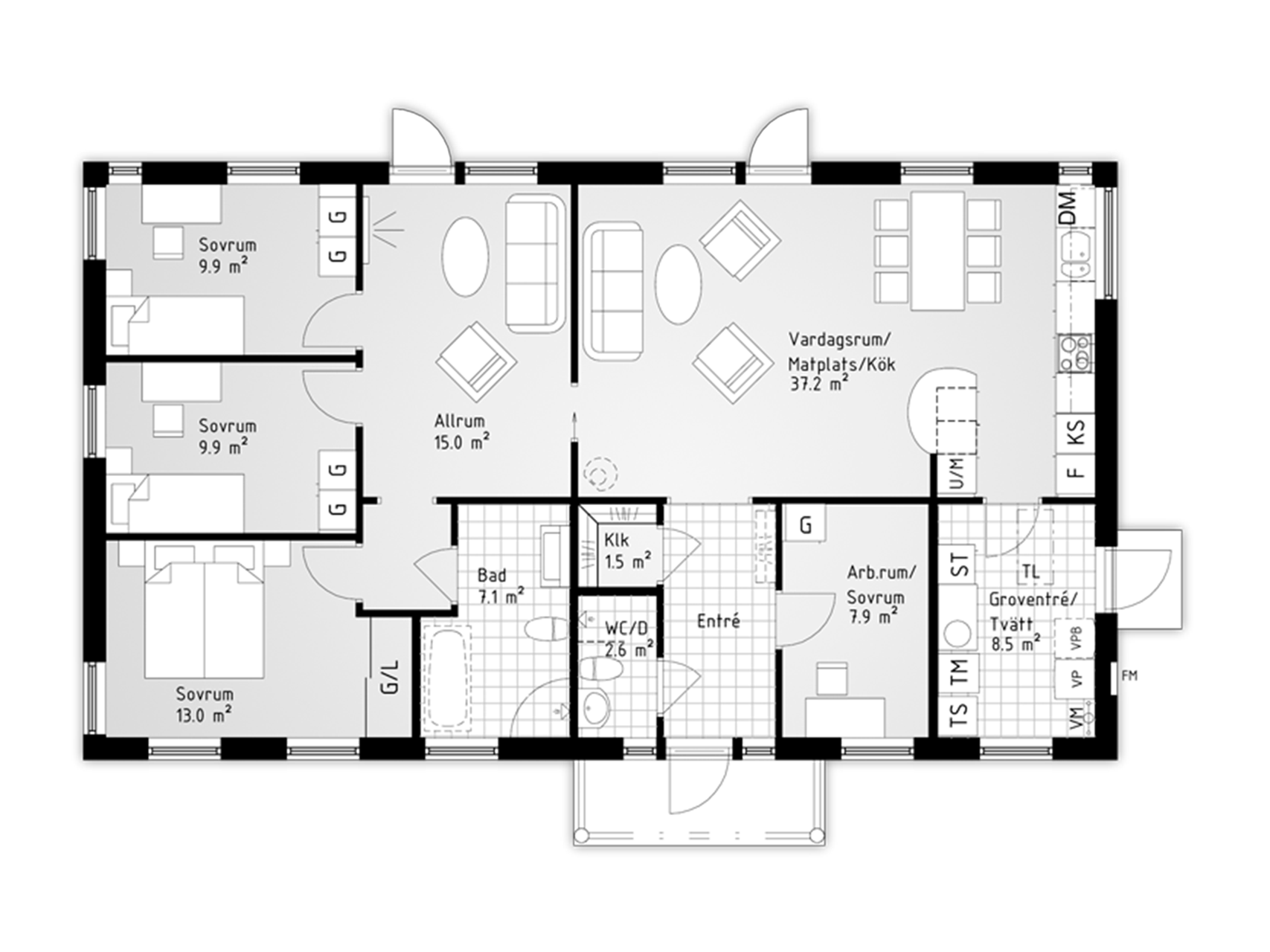 Köket skärmas av med hjälp av en bardisk som också gör sig bra som frukostbord. I en tydligt avgränsad del av huset ligger den mer privata delen. Allrummet för fredagsmys flankeras av tre sovrum och har en altandörr som leder ut till trädgården. Föräldrasovrummet har en egen lite foajé och därigenom direkt tillgång till badrum med plats för både badkar och dusch.