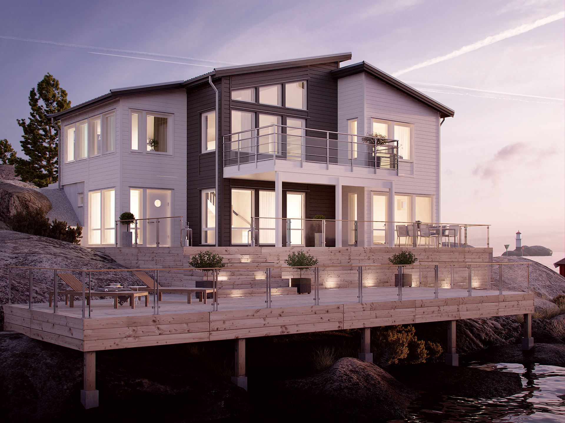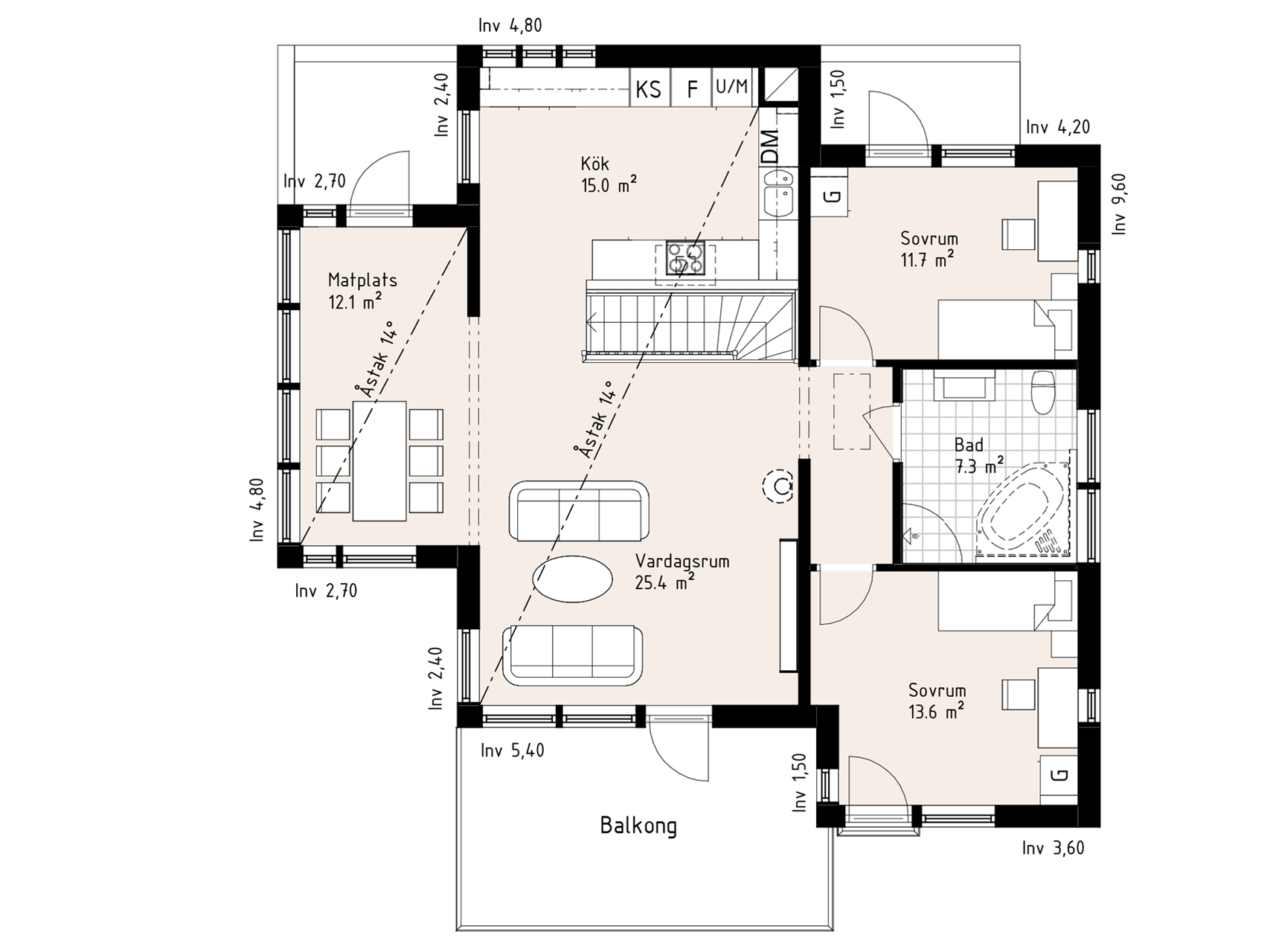 Det här är ett imponerande sluttningshus som vi har ritat för dig som både vill ha stora sovrum och sällskapsytor. Entrén ligger i nära anslutning till tvättstugan och en generös klädkammare. Trappan leder direkt upp till umgängesytorna.