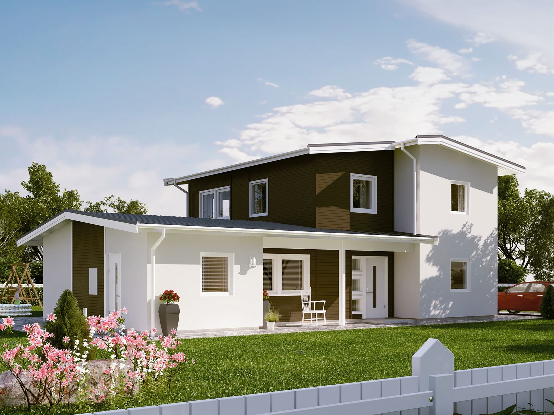 Axanäs är ett flexibelt hus med många möjligheter och tidlös design. En utskjutande takfot ger husets fasad ett speciellt utseende.