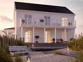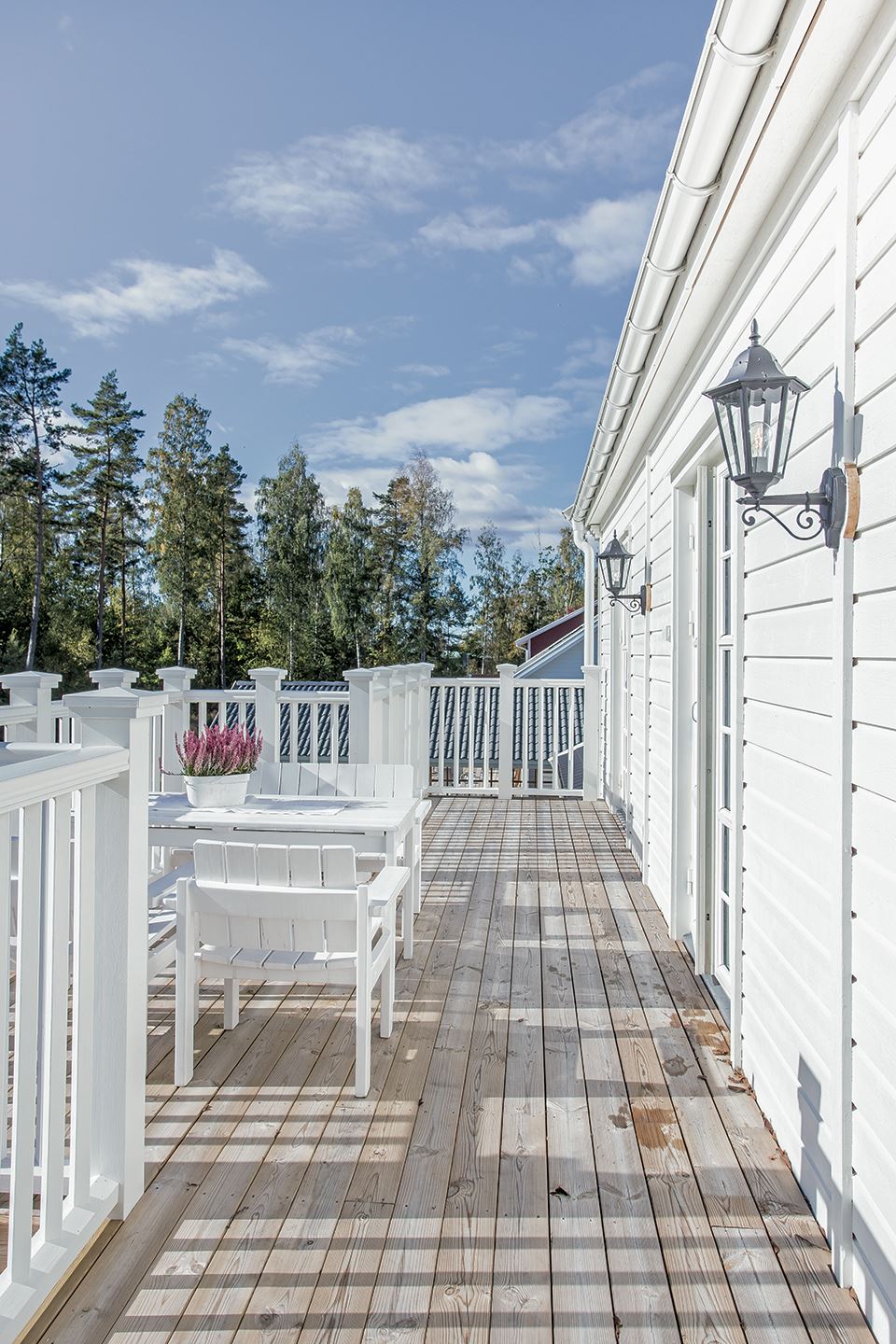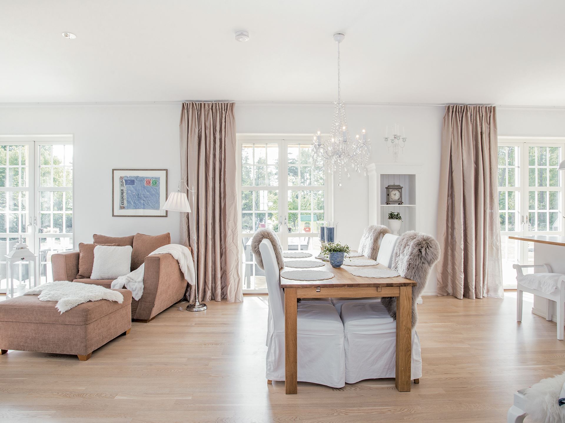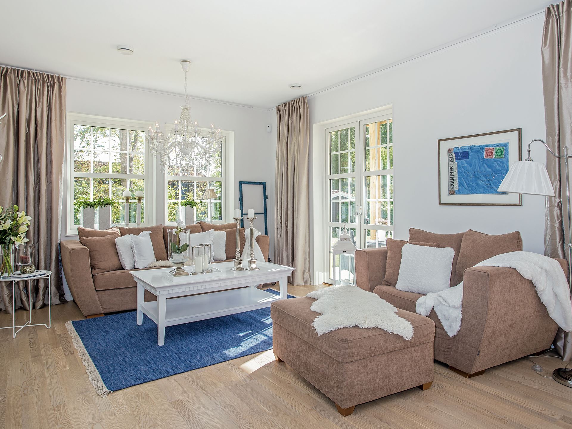 Vardagsrummet har tre pardörrar som öppnar upp mot havet samtidigt som de släpper in ljuset. Planlösningen är baserad på huset Kungshamn och på övervåningen finns bland annat ett rejält badrum, ett dressingroom och ett stort allrum.