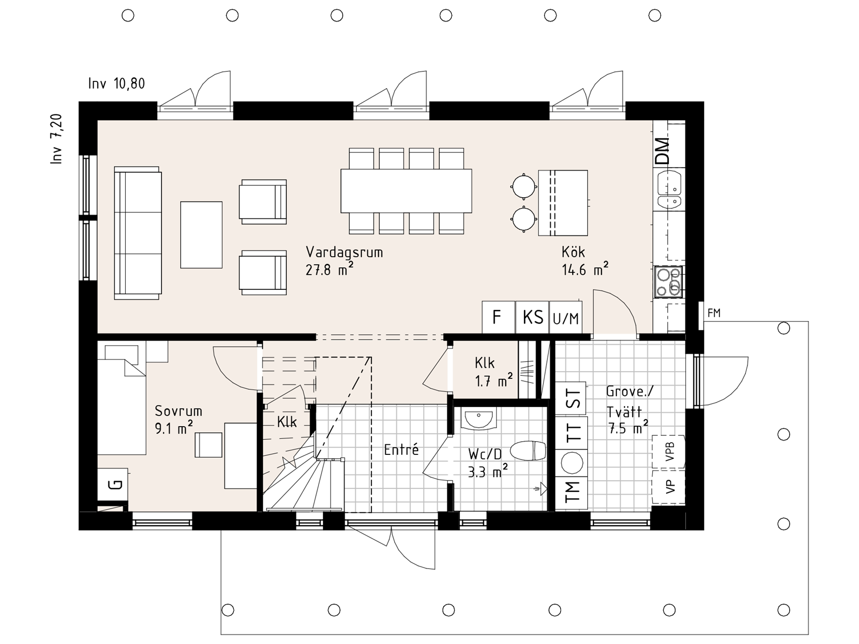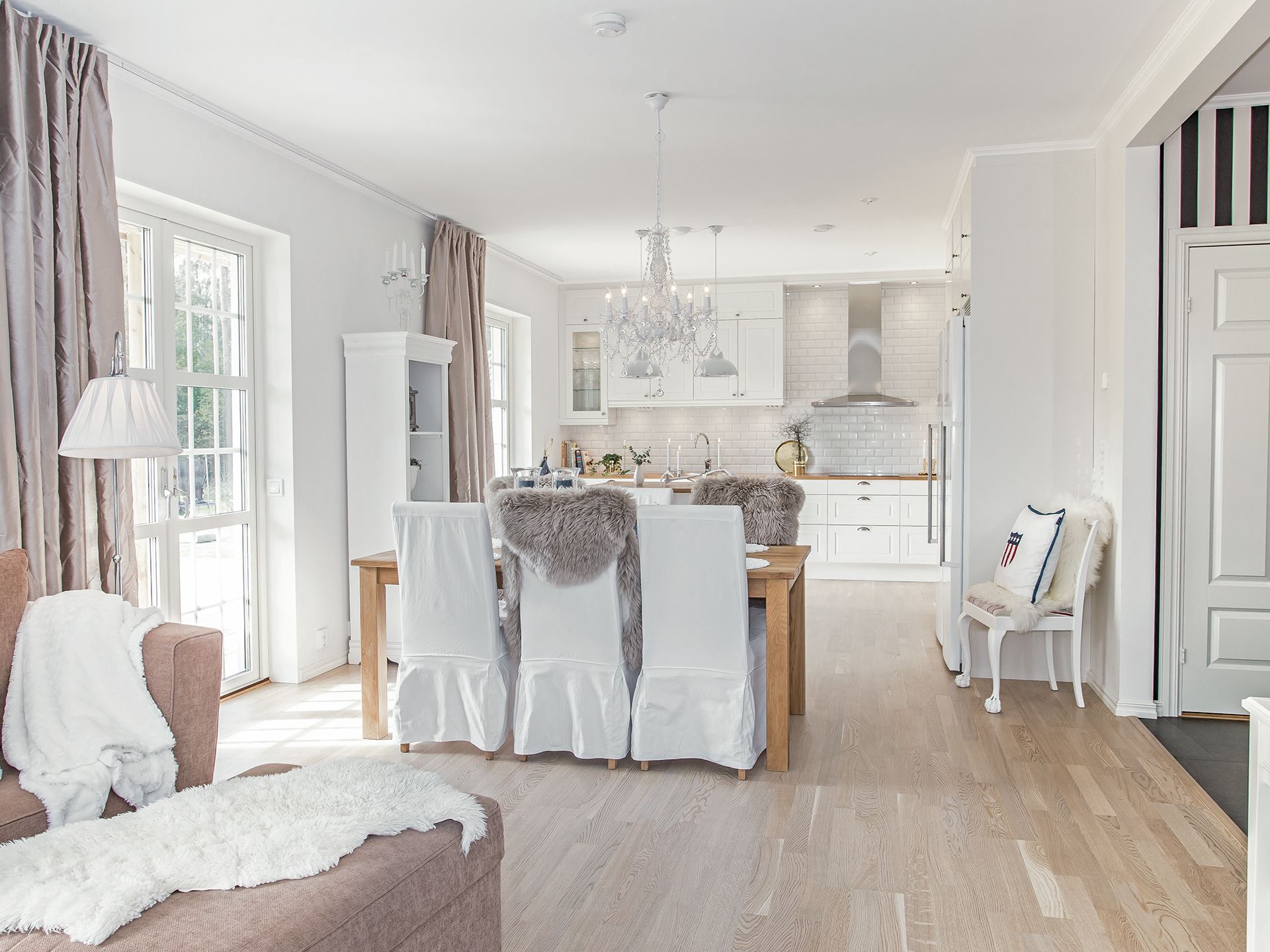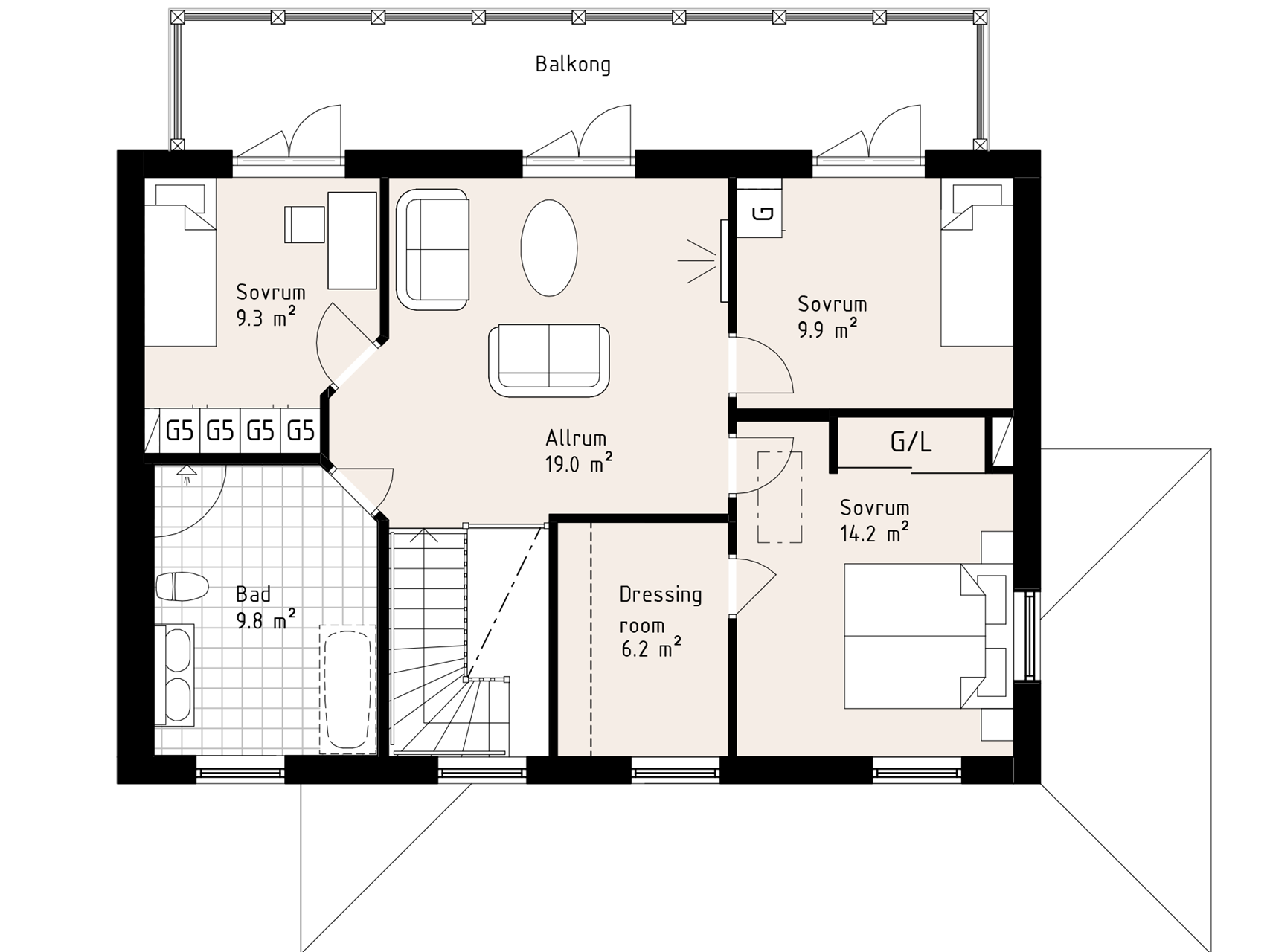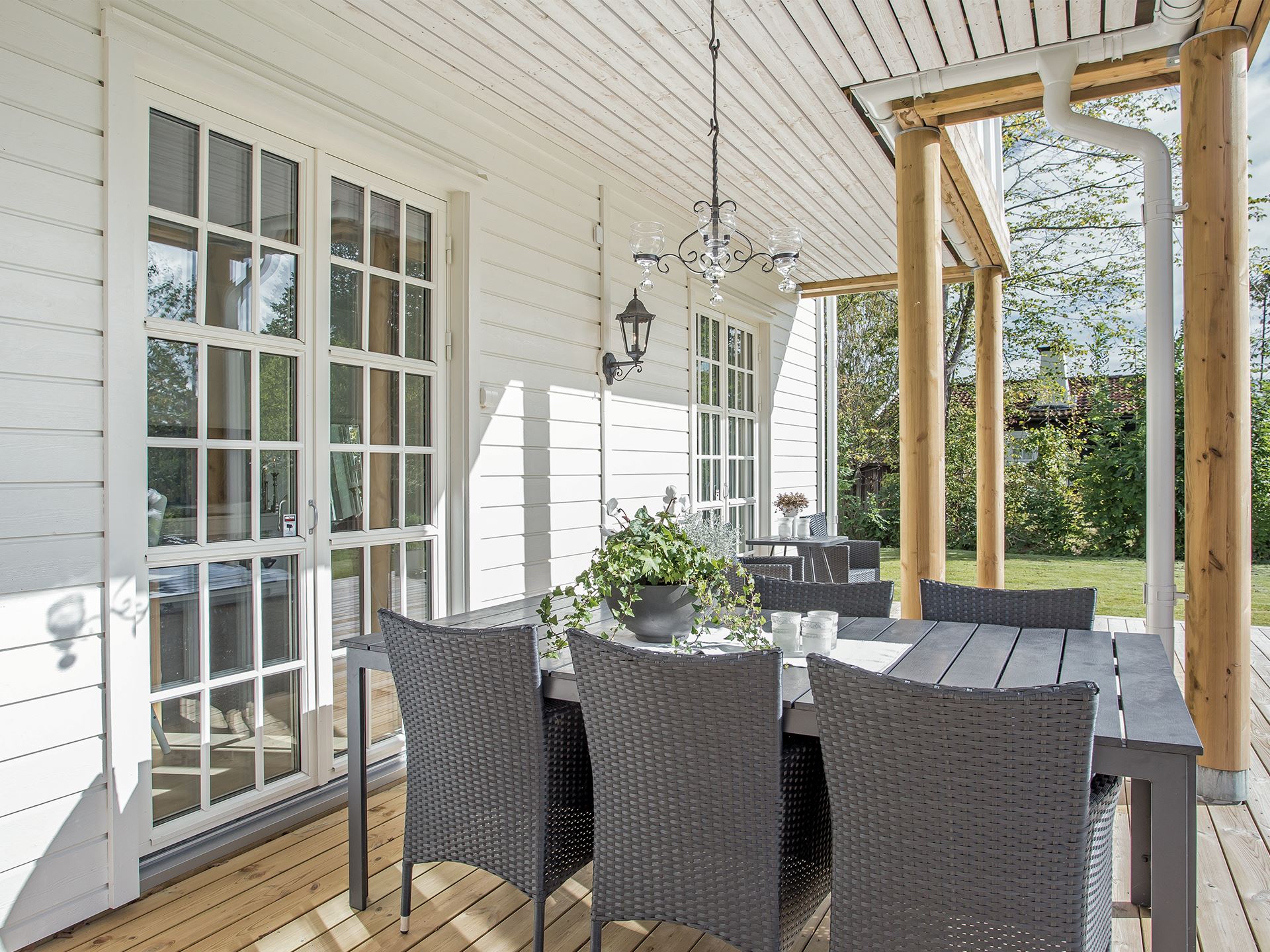 Vardagsrummet har tre pardörrar som öppnar upp mot havet samtidigt som de släpper in ljuset. Planlösningen är baserad på huset Kungshamn och på övervåningen finns bland annat ett rejält badrum, ett dressingroom och ett stort allrum.