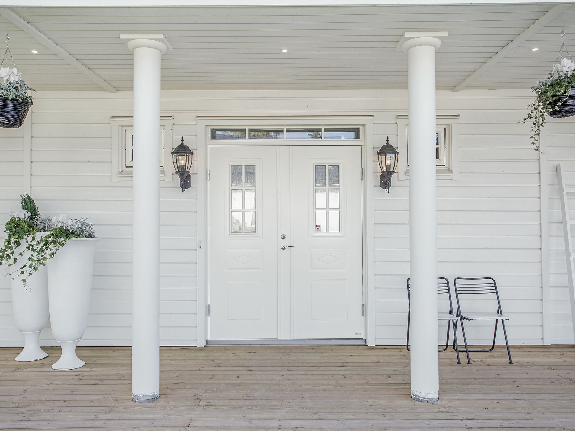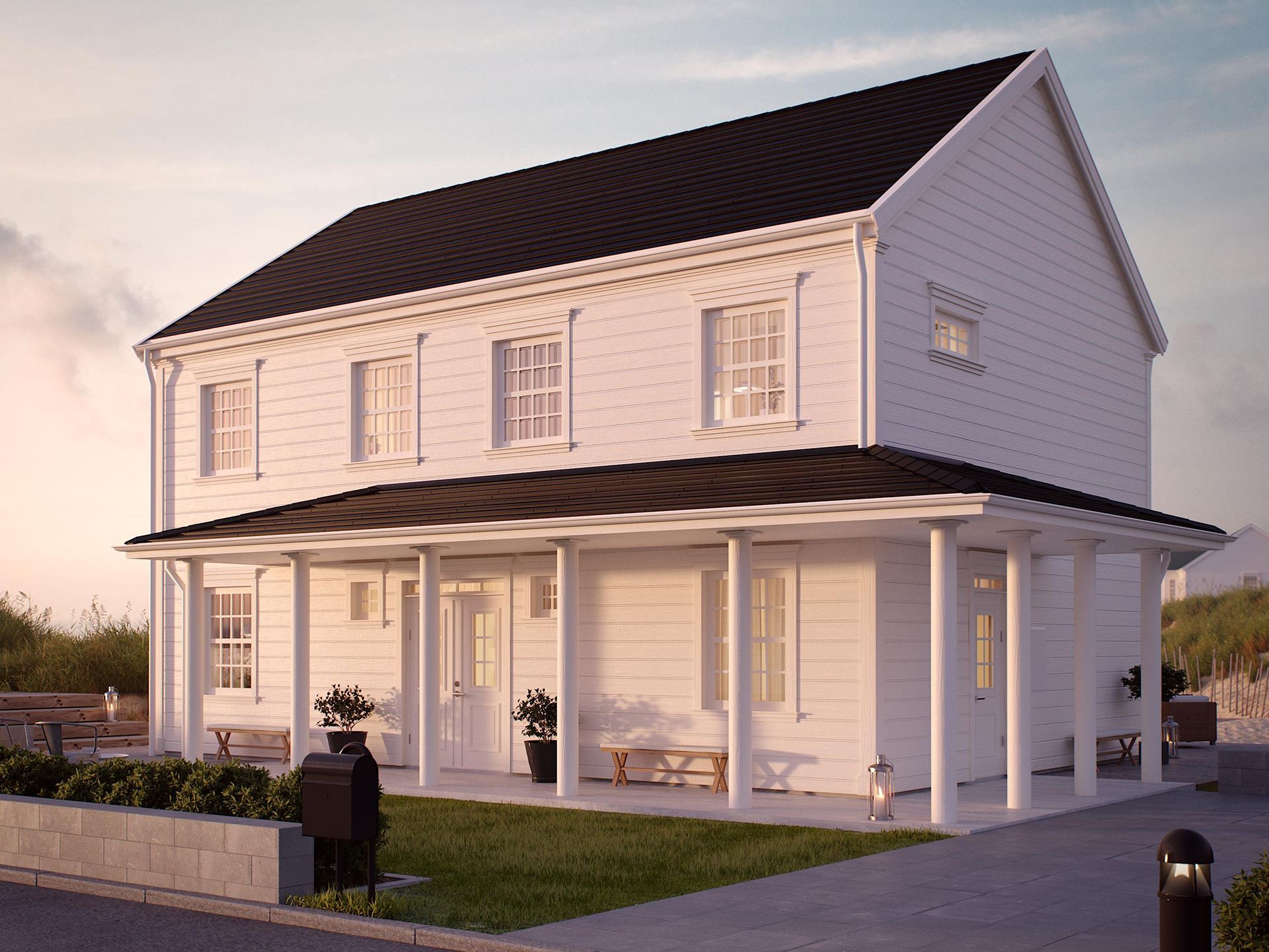 I USA är det väldigt populärt med en väderskyddad uteplats. Det ville jag spegla i Cobb Bay med en rejäl veranda och en långsträckt balkong. Entrétaket och balkongen ger skydd från sol och regn och stöttas av pelare som ger huset en speciell karaktär. Arkitekturen är symmetrisk, med stora spröjsade fönster.