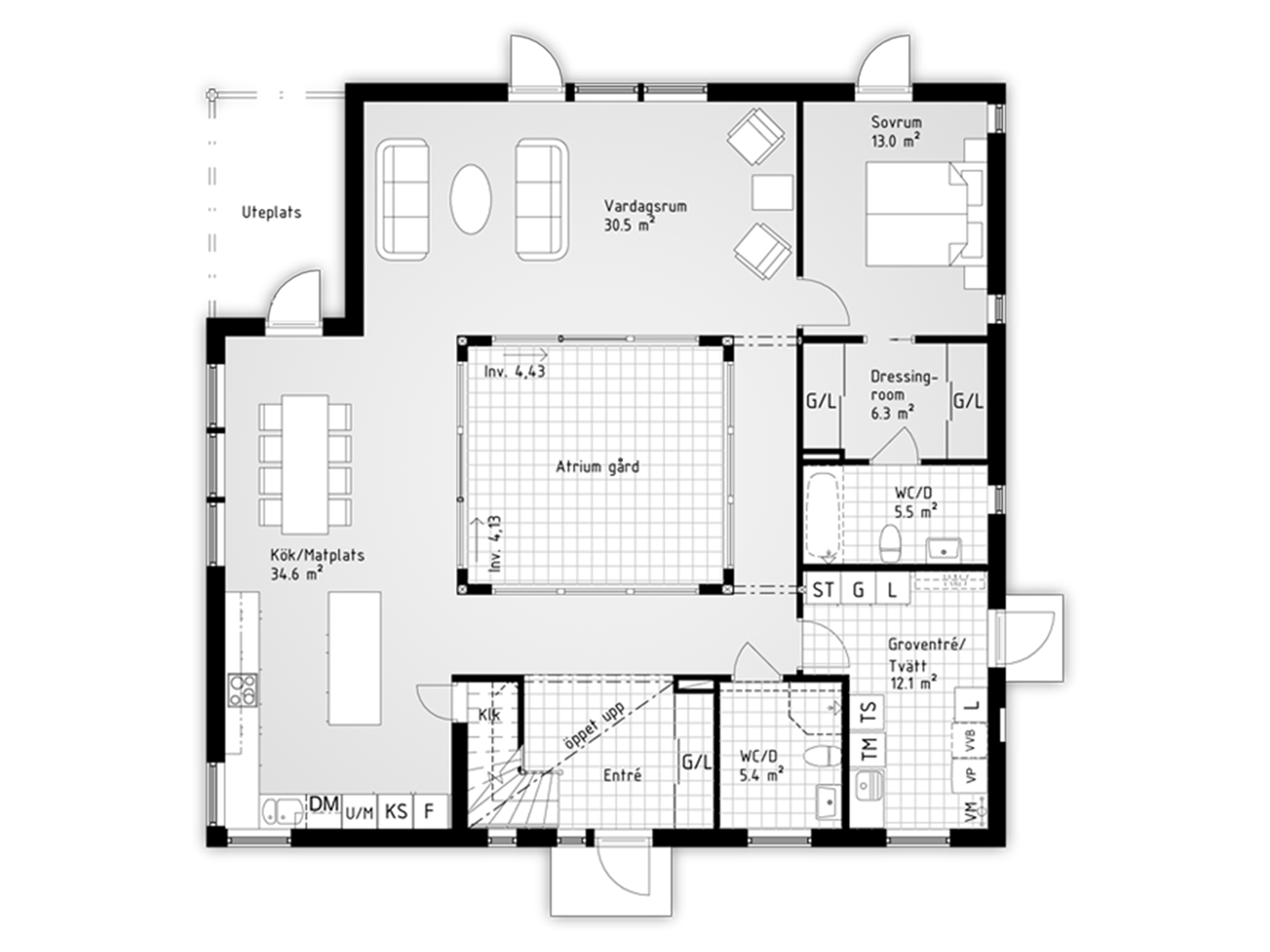 Detta är ett stort och lyxigt hus för barnfamiljer som önskar det lilla extra. Siktlinjen från entrén, genom den inglasade innergården, avslutas ute i trädgården och ger en känsla av oändlighet.