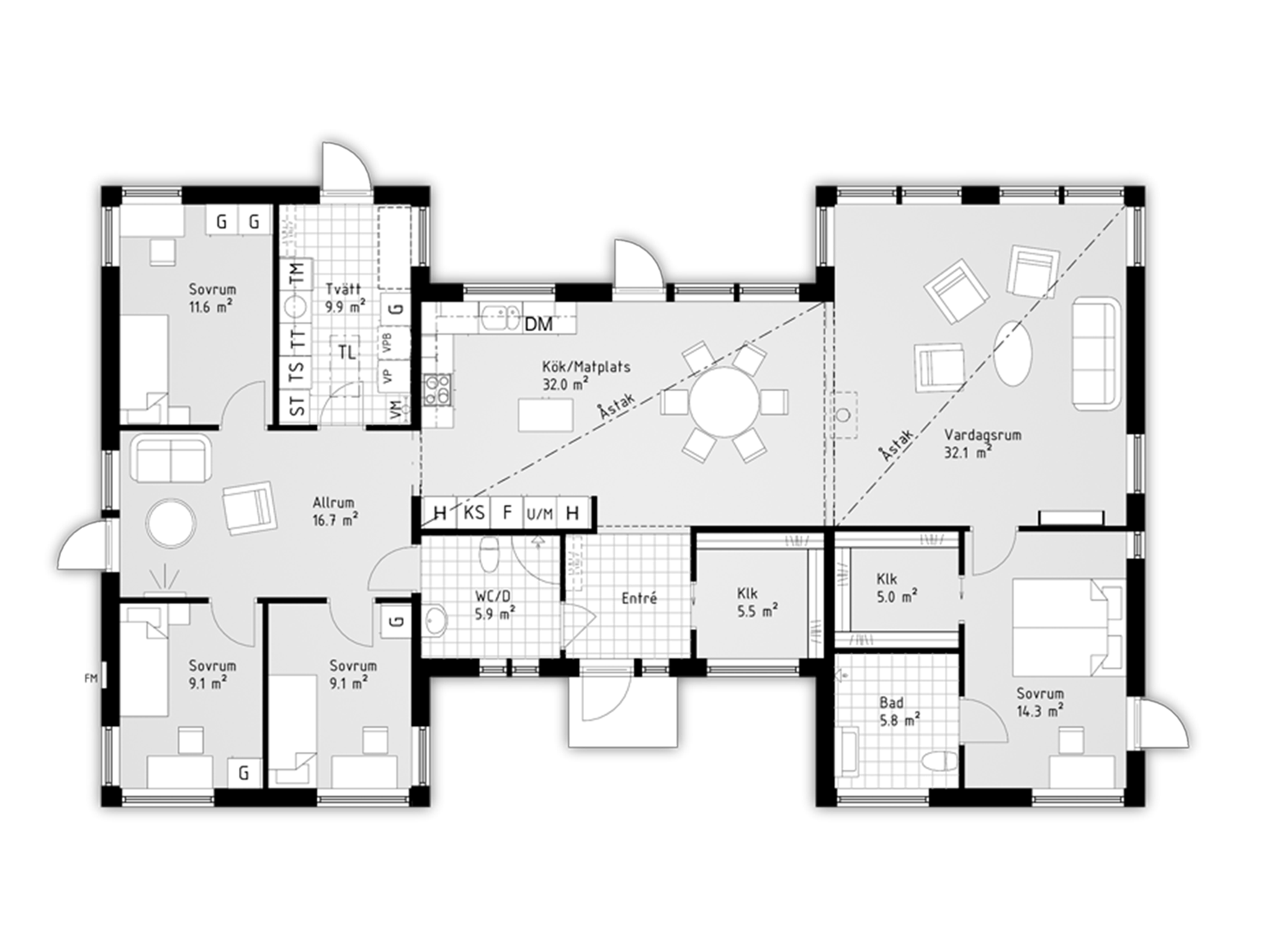I den ena flygeln finner du ungdomsdelen med tre sovrum, stort allrum, tvättstuga och badrum med dusch. I den andra flygeln finns vardagsrummet som med sitt ryggåstak gör att umgängesdelen känns extra luftig. I samma flygel finns även föräldrasovrummet med klädkammare och eget badrum med plats för hörnbadkar – extra uppskattat efter en tuff arbetsvecka. Planlösningen i det här huset är mycket flexibel och kan ändras efter önskemål.