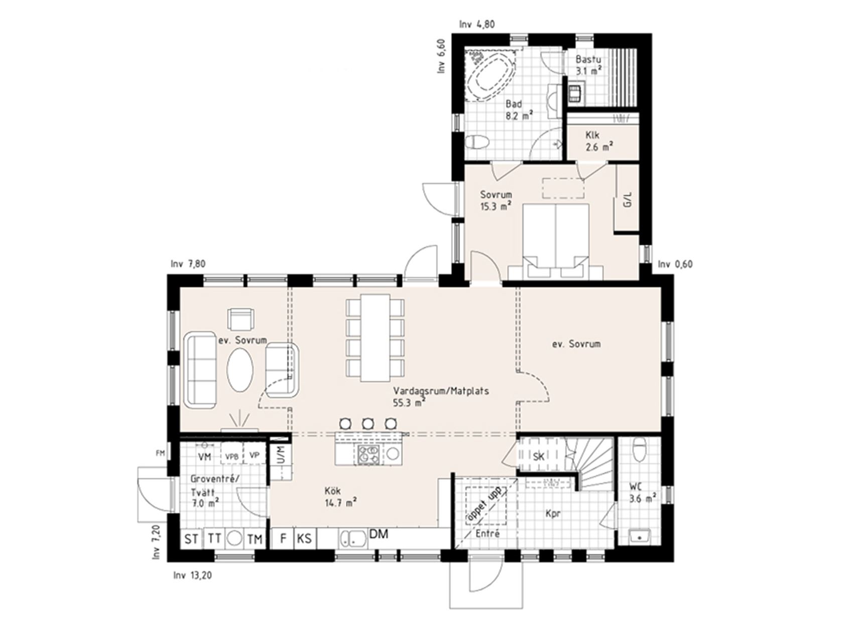 Mångsidig familjevilla med lyxig, separat föräldraflygel med plats för alla bekvämligheter. Det centrala köket på entrévåningen utgör en naturlig mittpunkt i denna ljusvänliga husdesign som präglas av stora fönsterpartier mot trädgården samt generösa takfönster. Via den rymliga entréhallen leder trappan upp till en ljus övervåning med allrum, tre sovrum, badrum och klädkammare. Dalby kan även byggas med träfasad och utan flygel om du vill spara in på ytorna.