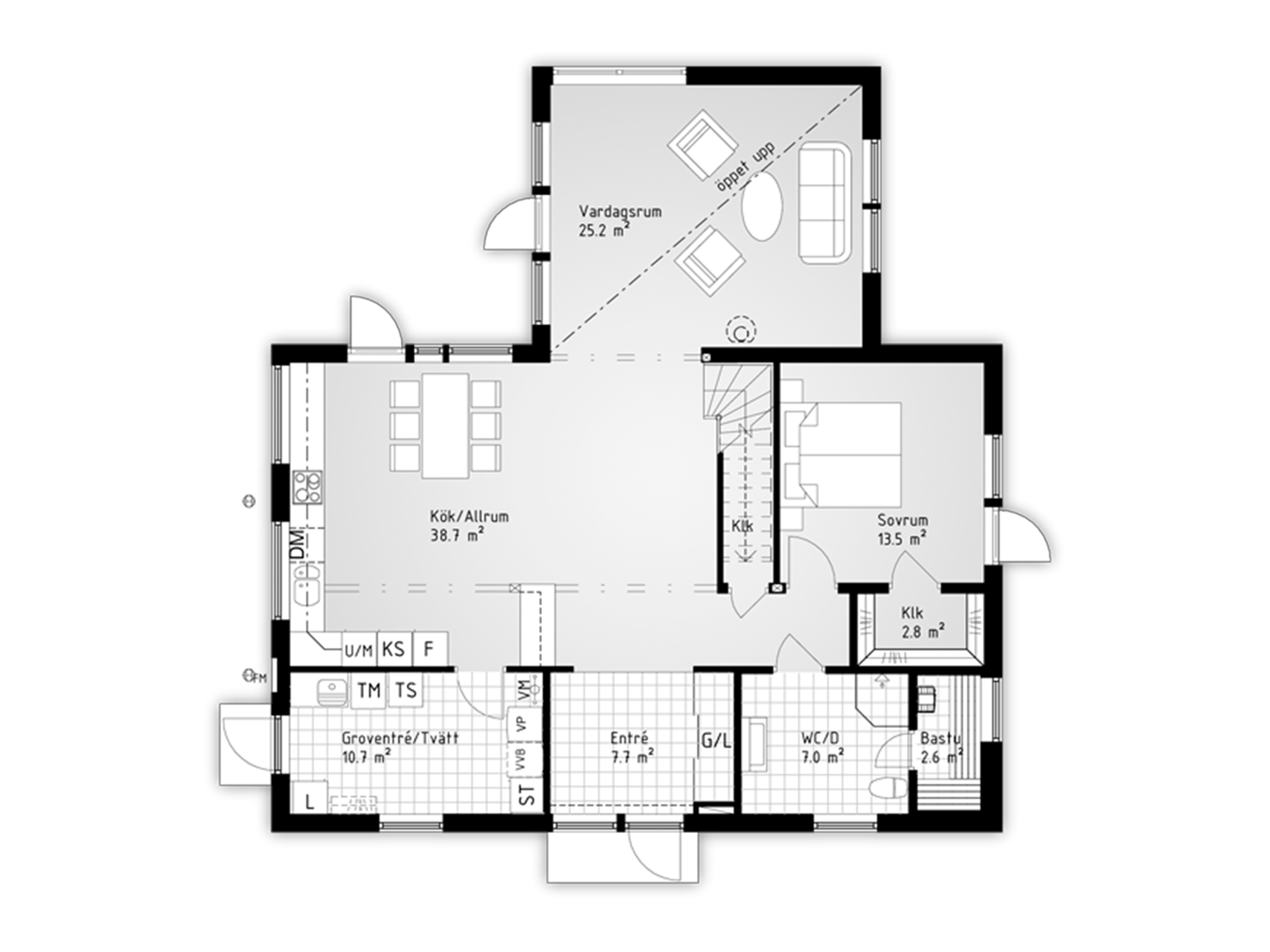 Perfekt för familjen som gillar att laga mat, provsmaka eller bara umgås runt spisen. Takhöjden på entrévåningen är 2,70 meter och tillsammans med de stora ytorna ger det god känsla av rymd.
