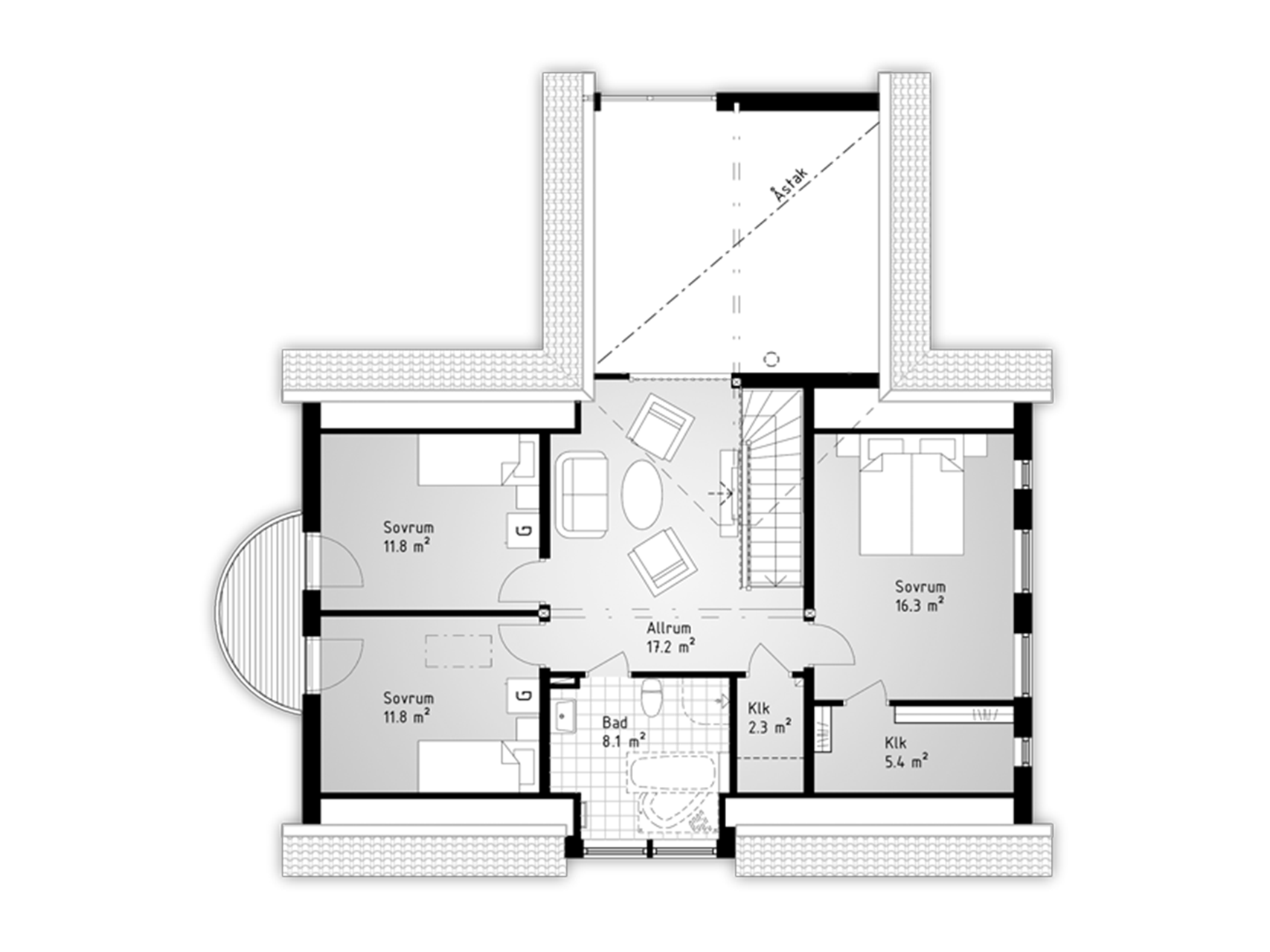 På andra våningen finns ett allrum med vy över vardagsrummet och ut genom de stora fönsterpartierna. Även badrummet på övervåningen har gott om både ljus och rymd tack vare den moderna kupan och dess stora fönster. Den halvrunda balkongen smyckar gaveln.
