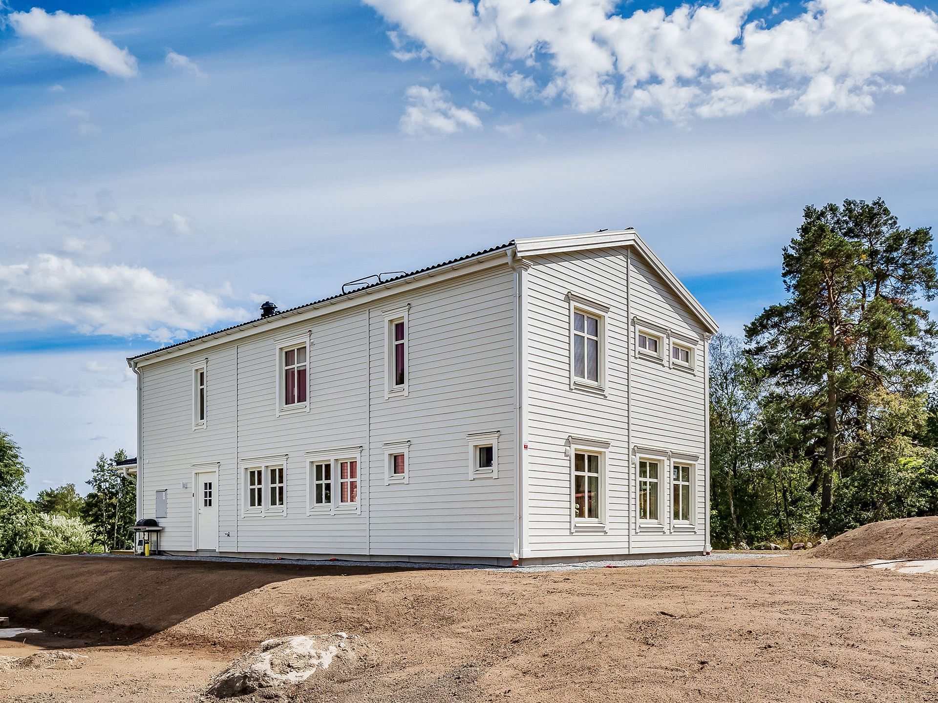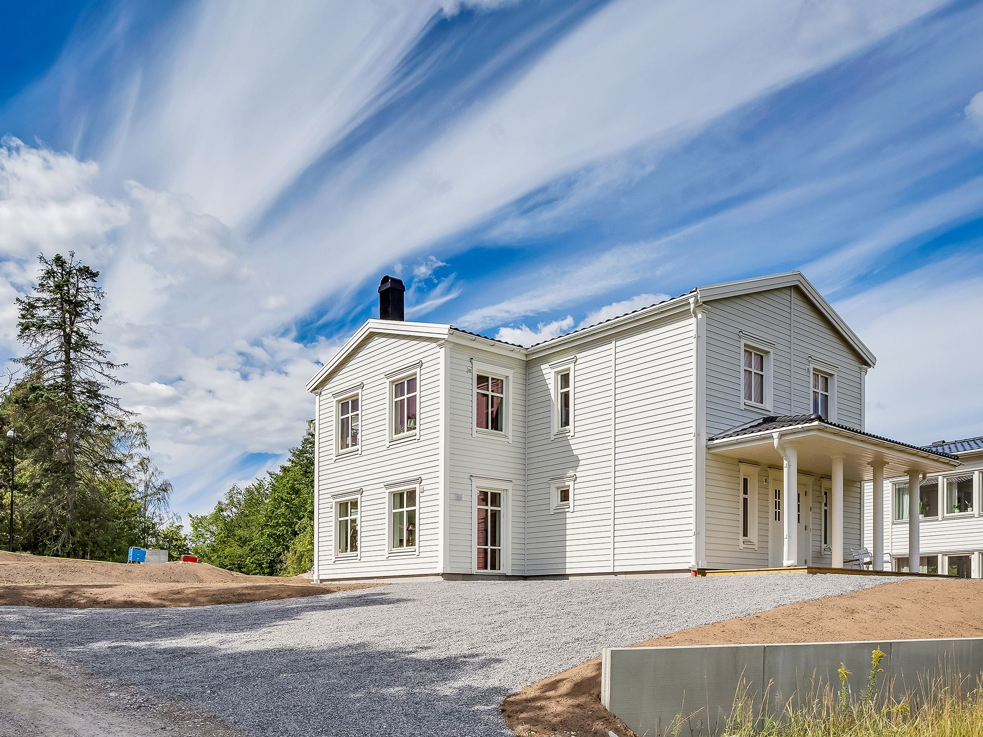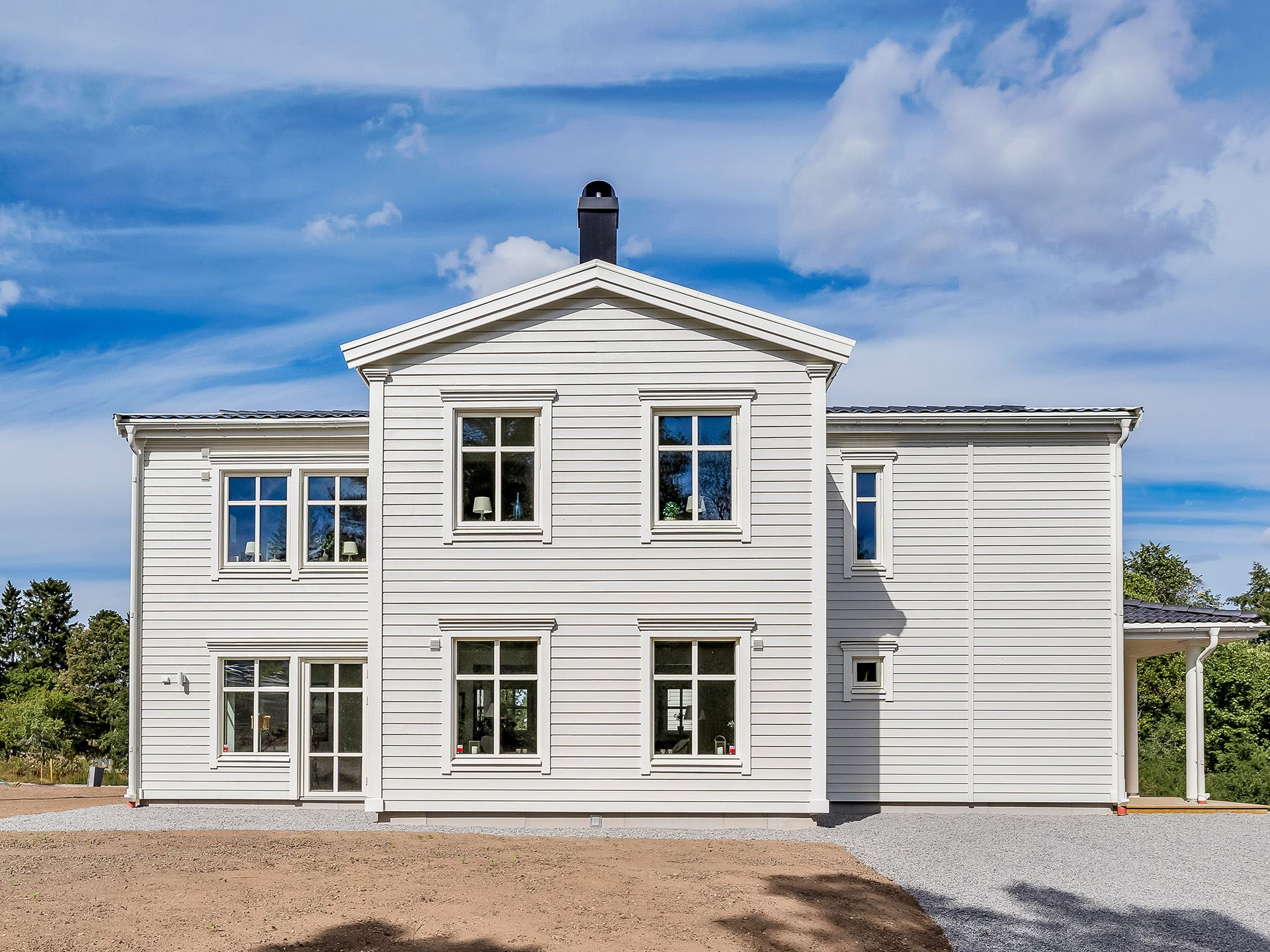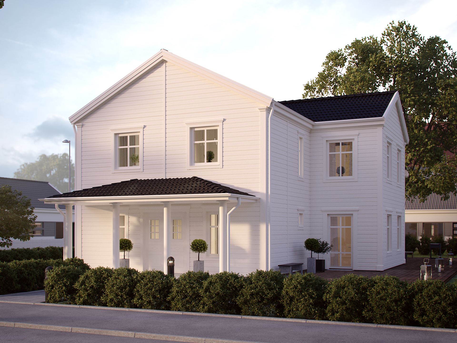 Det här tvåplanshuset har sin entré på gavelsidan och passar därför särskilt bra om du har en smal tomt. Utseendet är klassiskt New England inspirerat med liggande panel, hörnelement, fönsteromfattningar och en veranda som täcker hela gaveln.