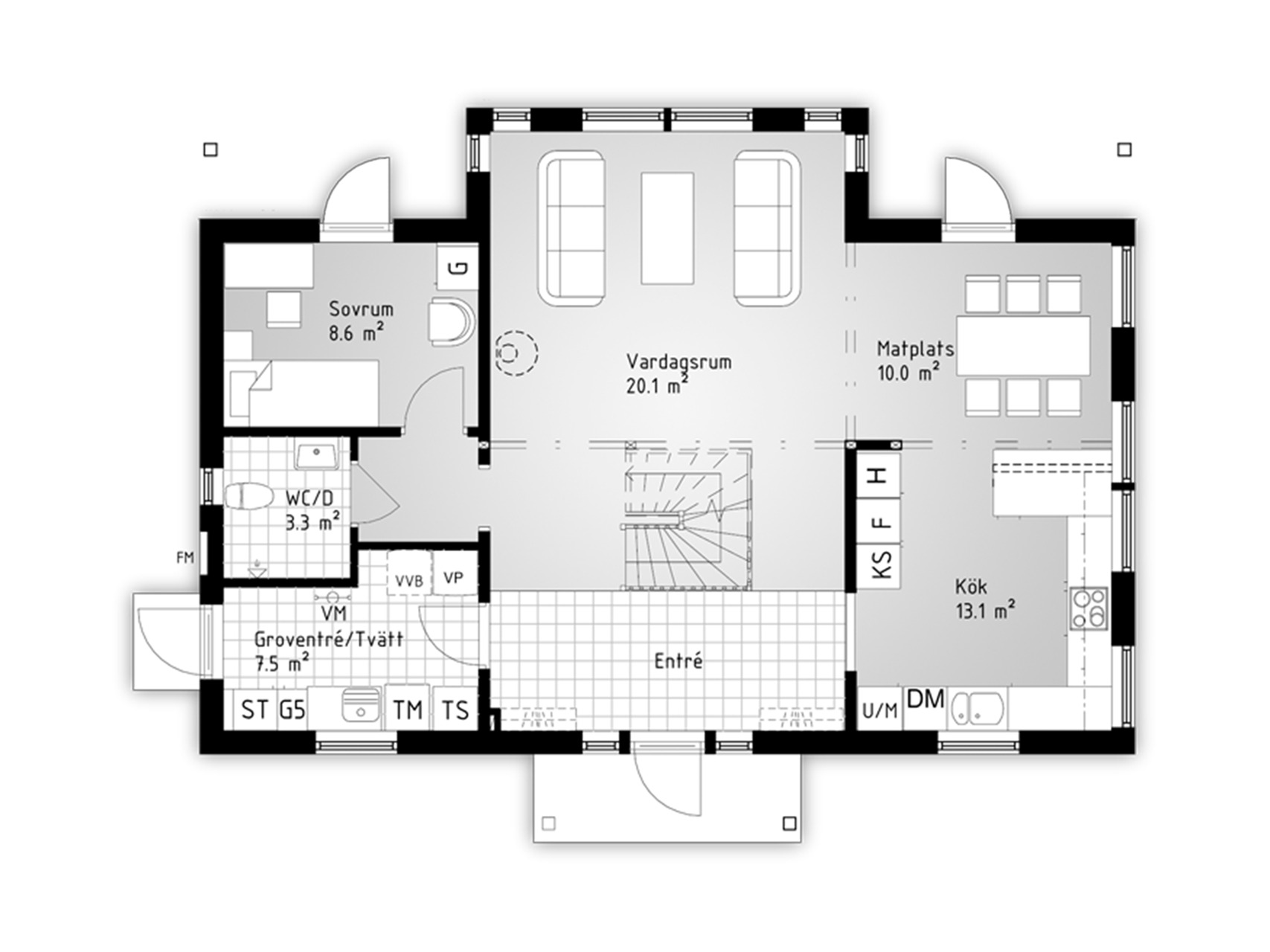 Köket är stort, har gott om arbetsyta och kontakt både med gata och med vardagsrummets matplats. Altandörrarna från matplatsen och sovrummet leder till uteplatser under tak. Det tvärgående ryggåstaket i allrummet förenar övervåningens fyra sovrum och ger också rymd åt badrummet. Allrummets fönsterparti med två altandörrar och fransk balkong släpper in rikligt med ljus.