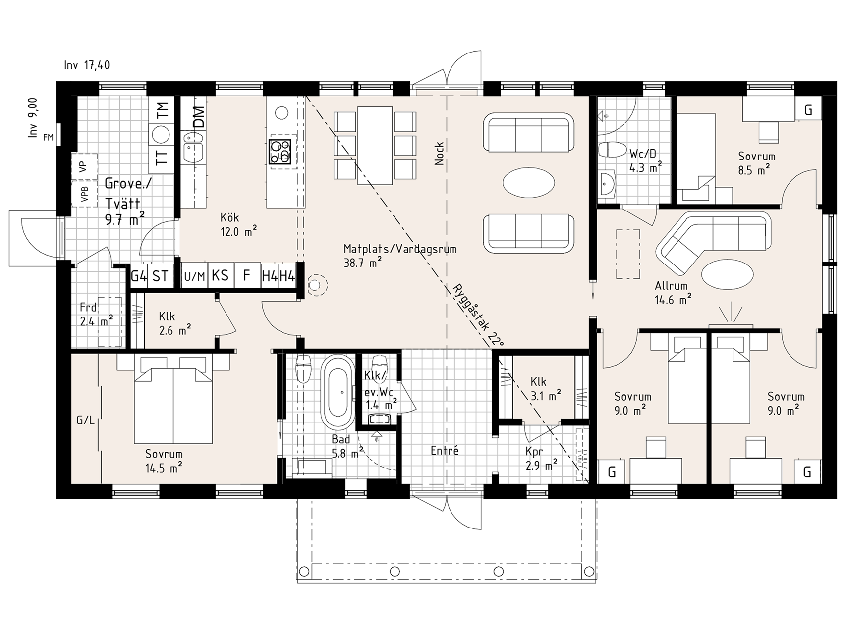 Föräldra- och barndelen finns på varsin sida om den öppna samvarodelen. Entrén har ett kapprum och en klädkammare som ger dig gott om förvaring.