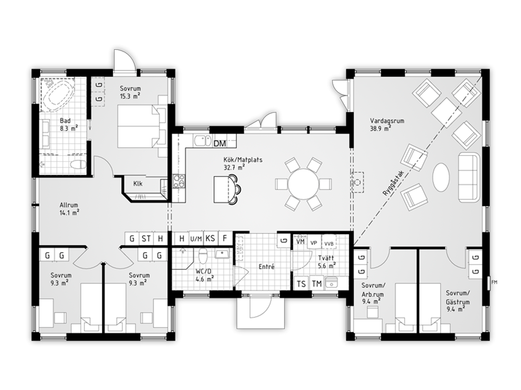 Är byggt som ett H och det ger en trygg symmetri och klara uppdelningar. Den skyddade entrén leder in i husets hjärta där förutom kök och matplats också tvättstugan finns.