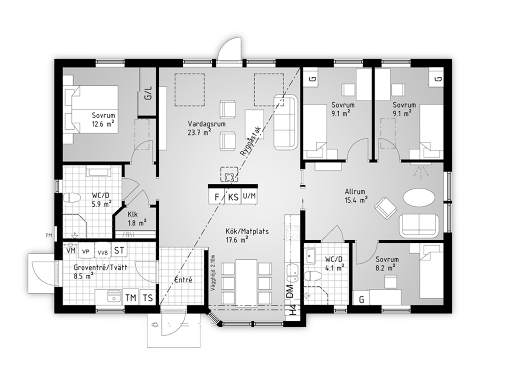 Föräldrasovrummet har ett eget badrum i direkt anslutning. matplatsens burspråk, tillsammans med det förlängda taket, ger skydd åt entrén. På gaveln ligger groventrén.