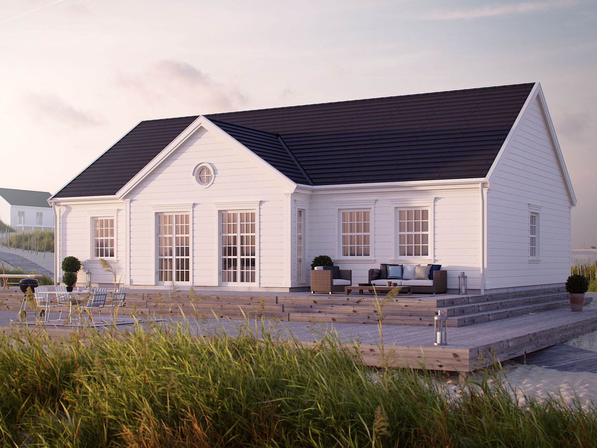 Grunden till den här planlösningen är hämtad från huset Båstad, men utseendet har en helt annan känsla med estetik från New England. Tanken är också att det ska påminna om en herrgård, vilket gör symmetrin särskilt viktig. Titta till exempel på fönstrens storlek och placering.