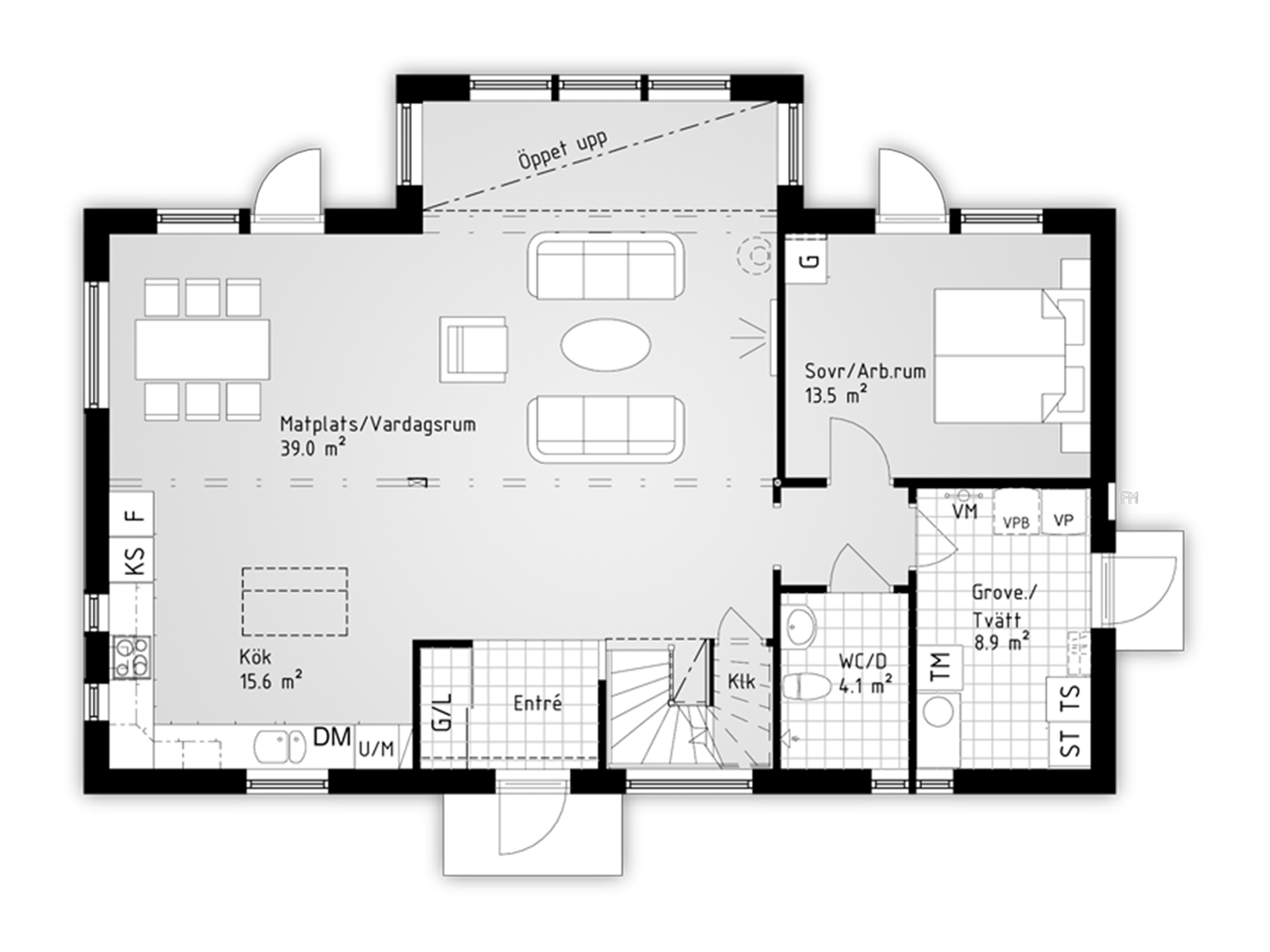 Kliv in i det här huset och se den öppna planlösningen där kök, vardagsrum och matplats huserar i ett enda stort rum. Att det dessutom är öppet mellan våningsplanen skänker än mer luftighet till entréplanet som även har ett sovrum/arbetsrum och groventré.