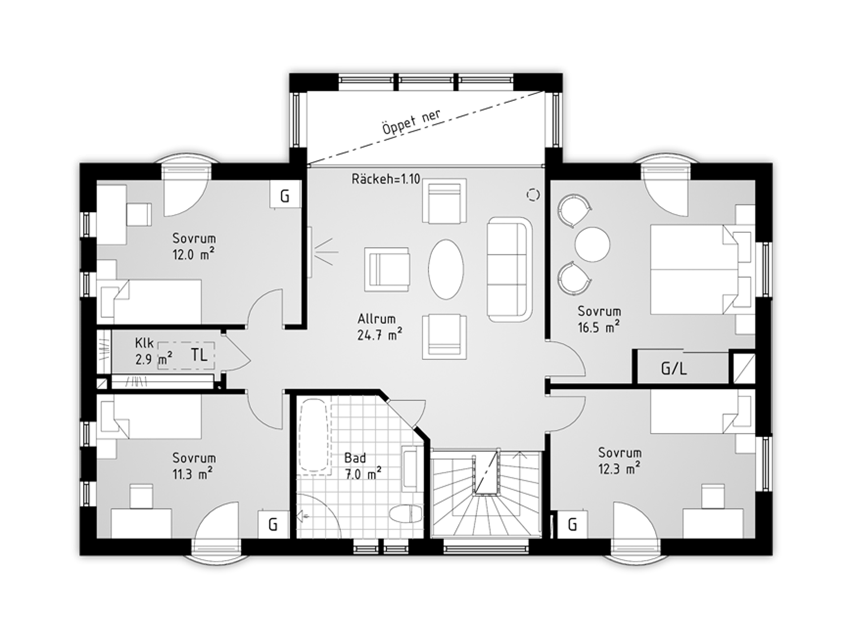 En trappa upp finns den lite mer privata delen med ett allrum i centrum, flankerat av fyra sovrum varav ett föräldrasovrum. Värt att notera är öppningen ner med sitt räcke som ger balkongkänsla. Här finns också en klädkammare med gott om plats för vinterjackor, golfset och de där byxorna som kanske passar till sommaren.
