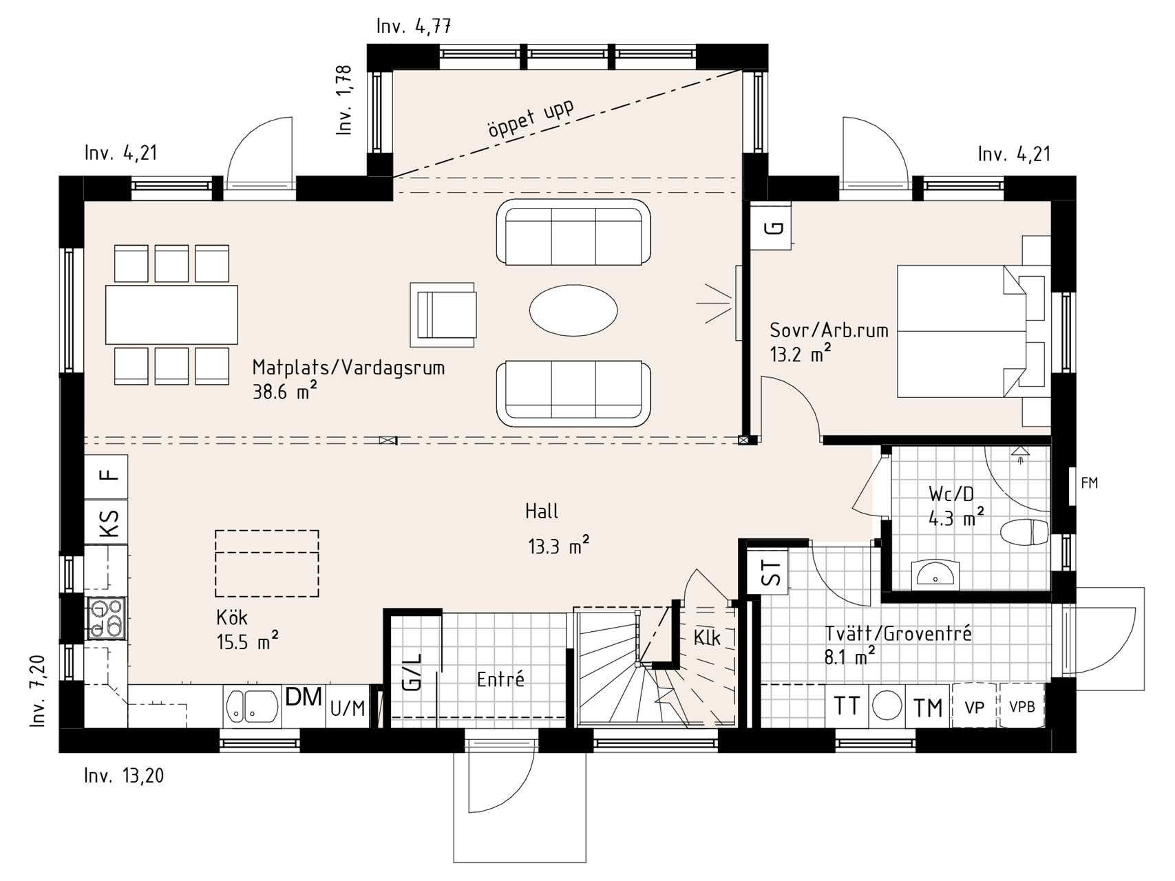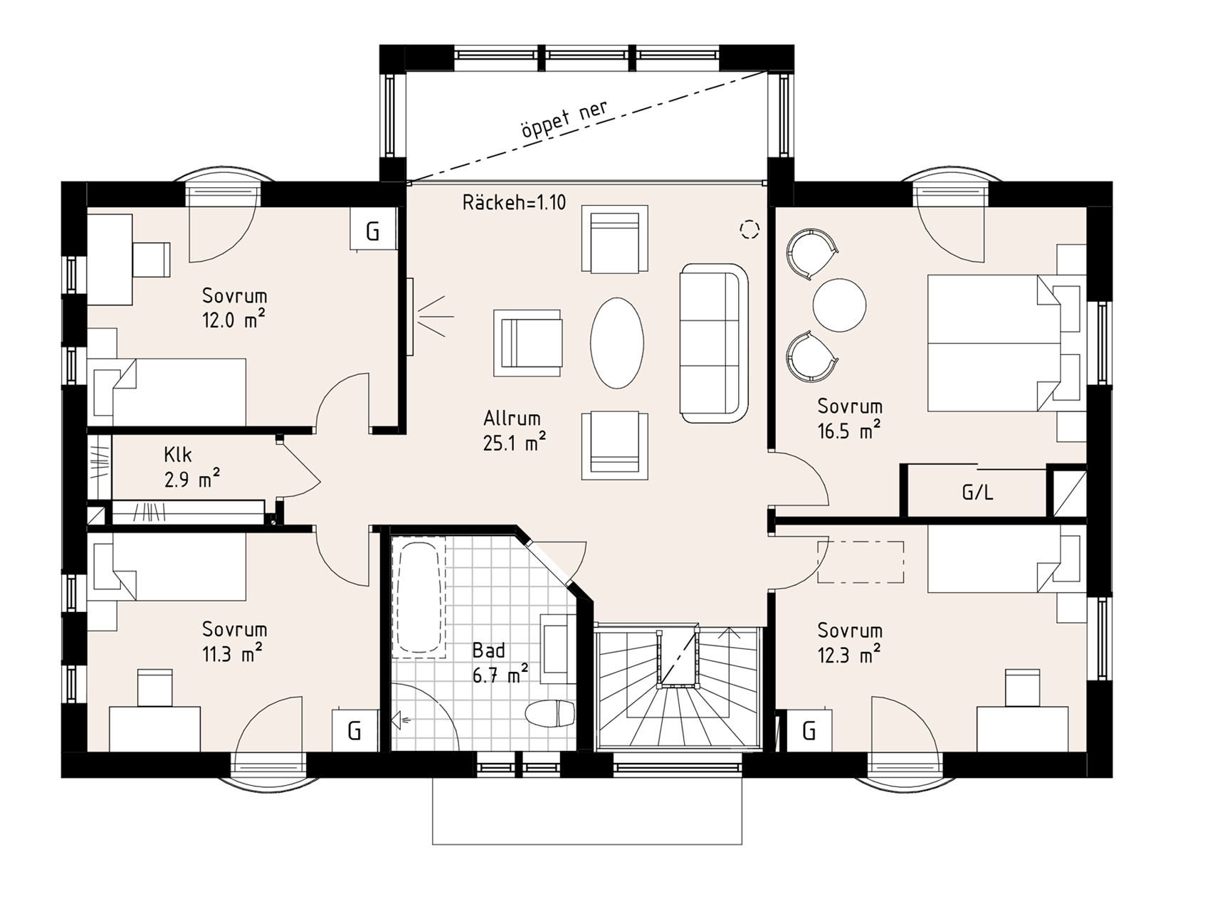 När du kommer in möts du av en öppen planlösning där det finns gott om plats för umgänge. En svängd trappa leder upp till övervåningens privata del med fyra stora sovrum, allrum och badrum. De två våningsplanen binds ihop av en öppning i golvet mellan allrummet och vardagsrummet, men du som vill ha en tystare och mer avskild miljö kan välja att bygga igen den ytan.