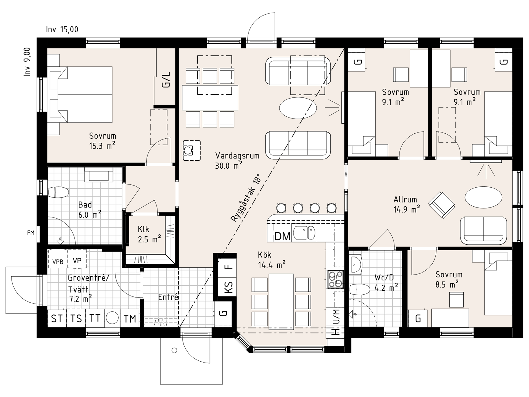 Ett ryggåstak löper genom hela den öppna ytan mellan vardagsrum och kök och ger ett luftigt intryck till husets sociala ytor. Föräldrarnas och barnens sovrum ligger åtskilda i var sin del av huset, med tillhörande badrum och WC. Den praktiska klädkammaren vid föräldrarnas sovrum kan också byggas om till bastu.