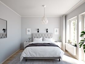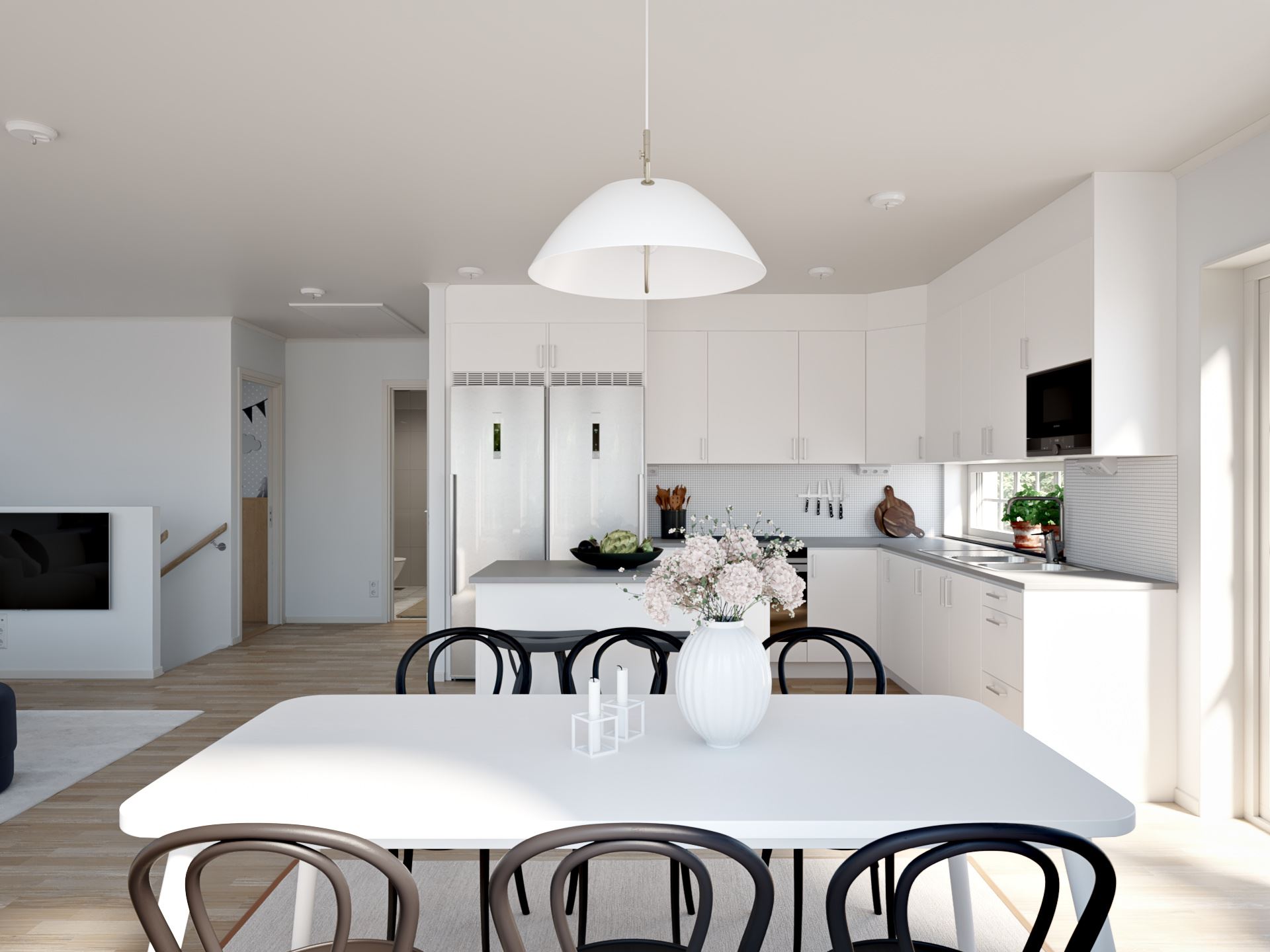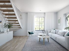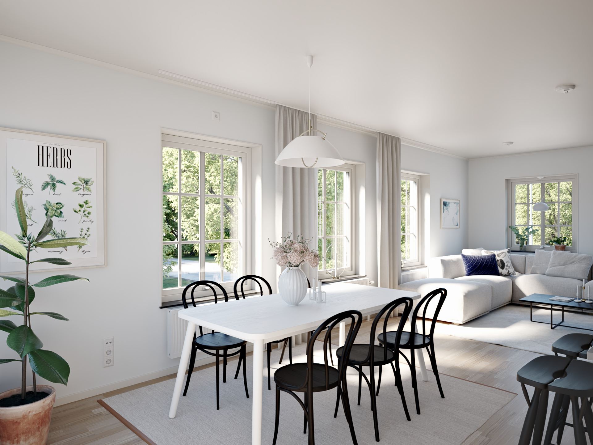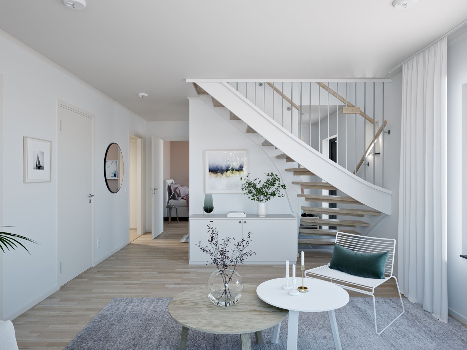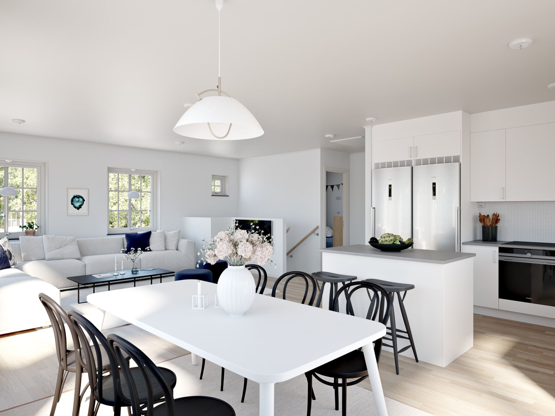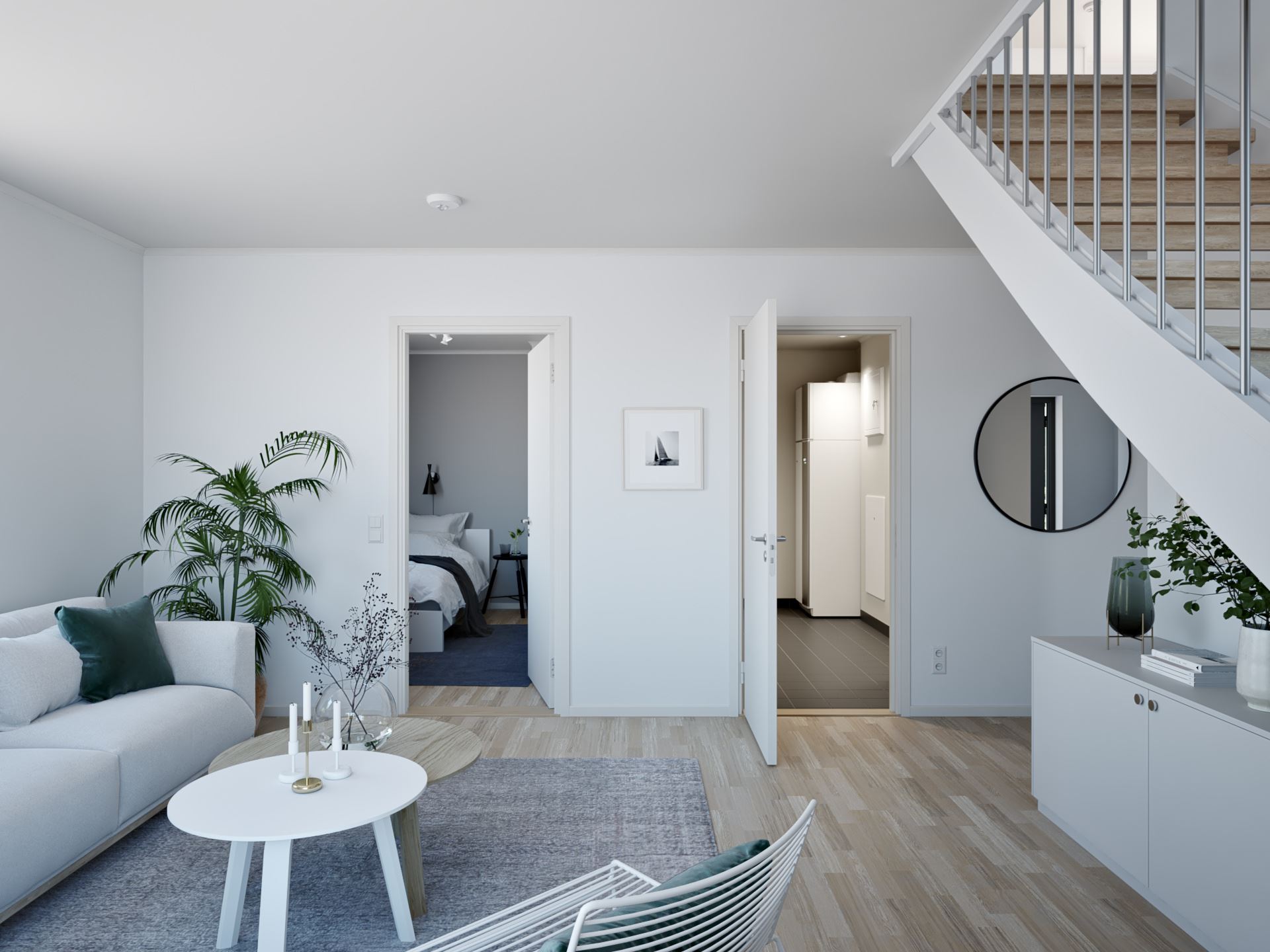 En trappa upp möts du av vardagsrum, kök och matplats i en öppen och luftig planlösning. På övervåningen finns även husets stora sovrum, ett badrum och ett rum som med fördel kan användas som gästrum.