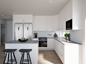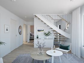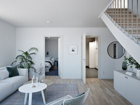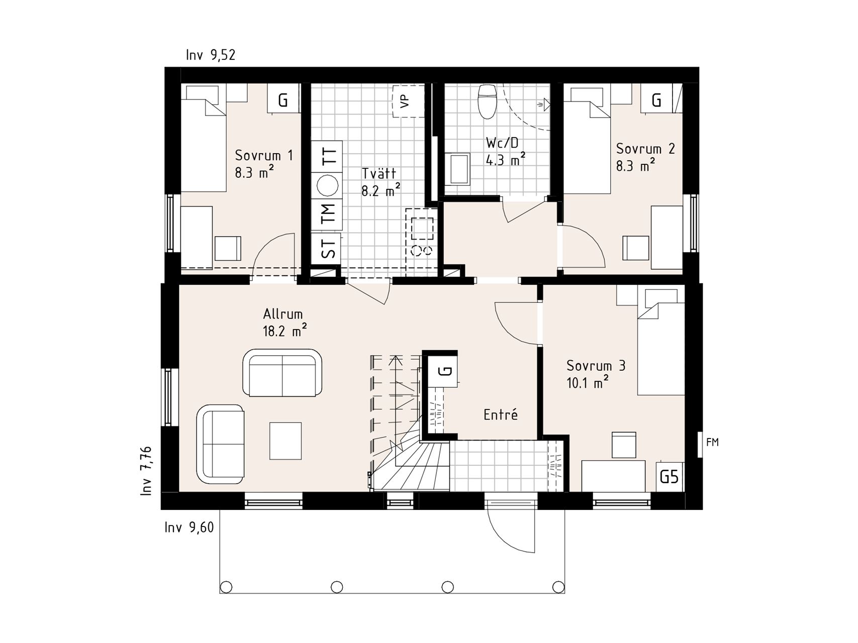 Det här planet är perfekt för familjens barn och ungdomar, med tre sovrum och ett allrum som har eget pentry. Och från entrén kan du även ta trappan upp till övervåningen, till husets gemensamma ytor. Planlösningen kan spegelvändas.