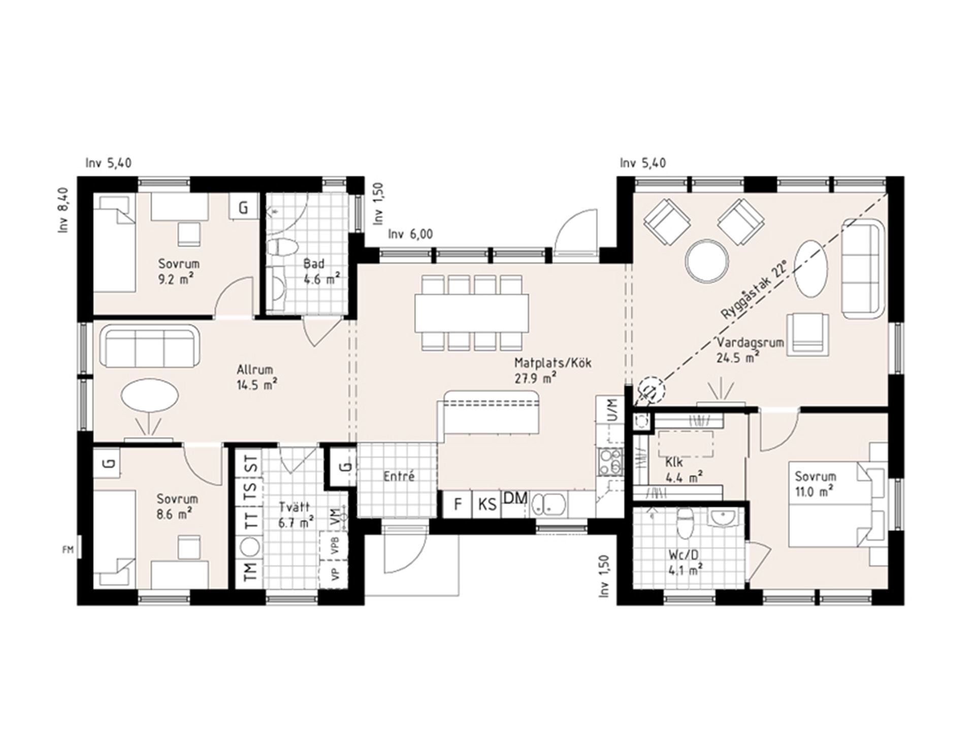 Modern villa som passar bra för en mindre familj. Redan i entrén möts du av ett stort ljusinsläpp och öppna ytor. Köksdel och matplats är centralt placerade i anslutning till vardagsrum och allrum, med gott om plats för matlagning och middagar. Vardagsrummets karaktär med ryggåstak och stora fönster ger ett behagligt ljus och blir en naturlig miljö för avkoppling och trivsel tillsammans.