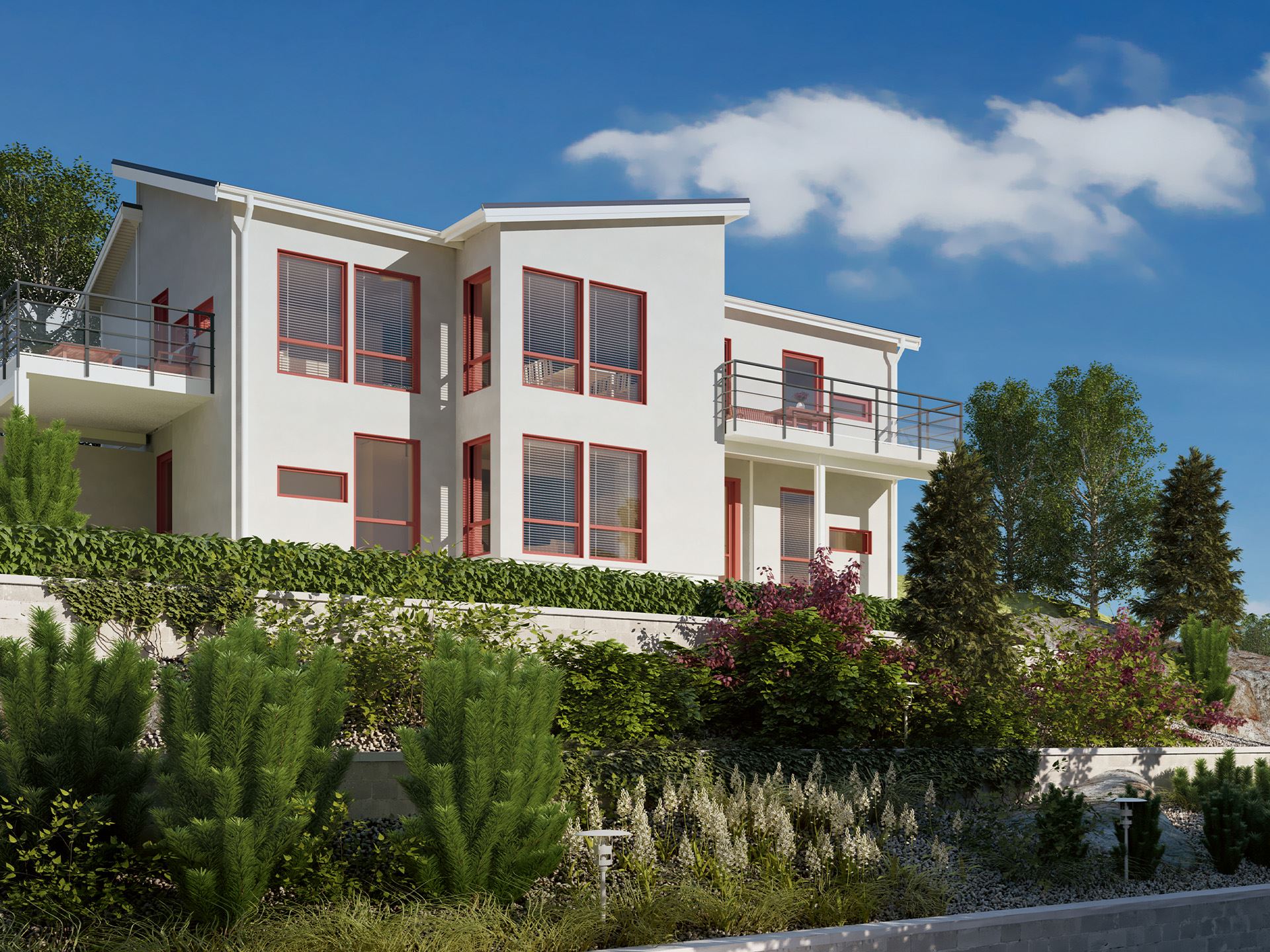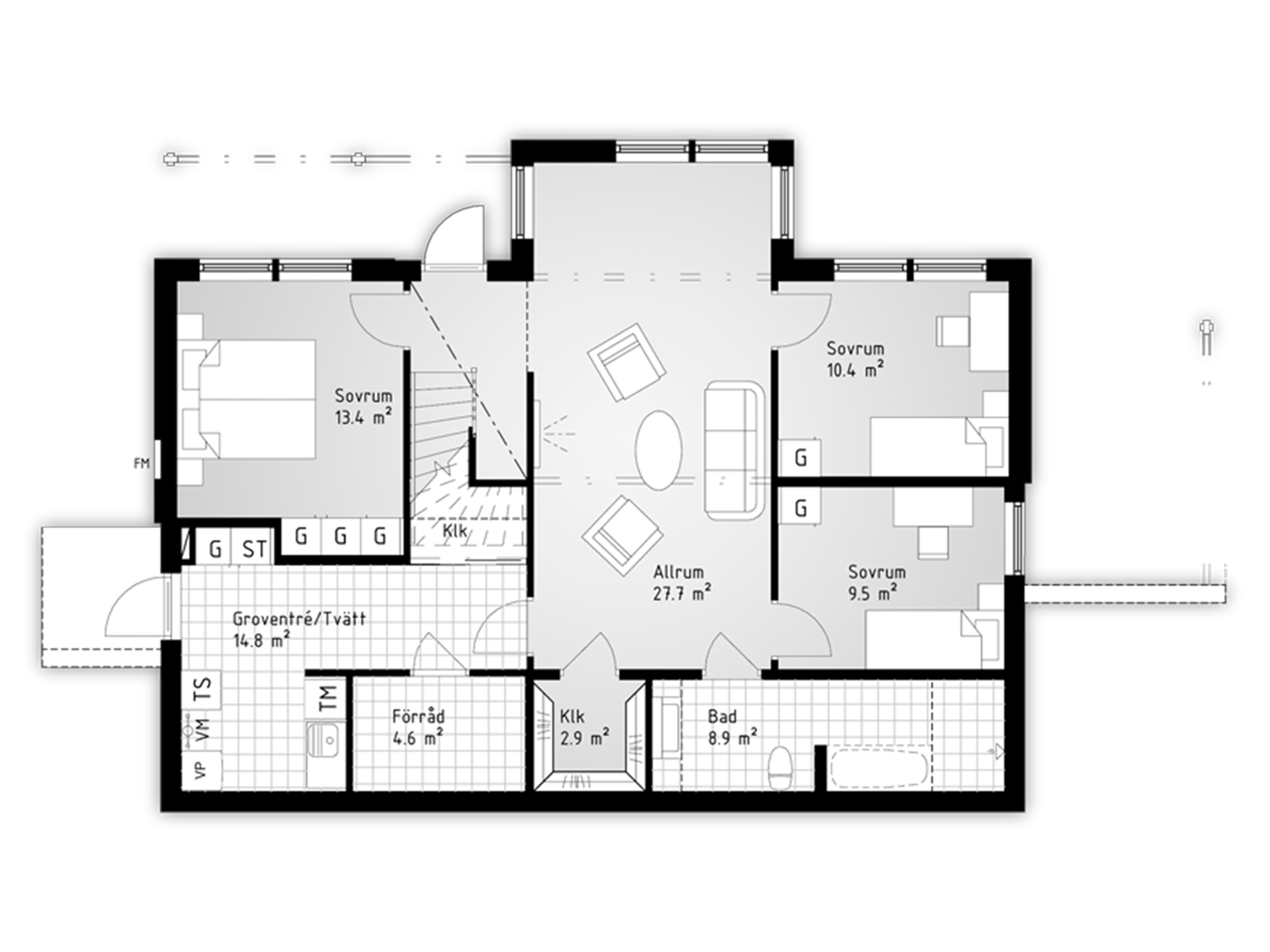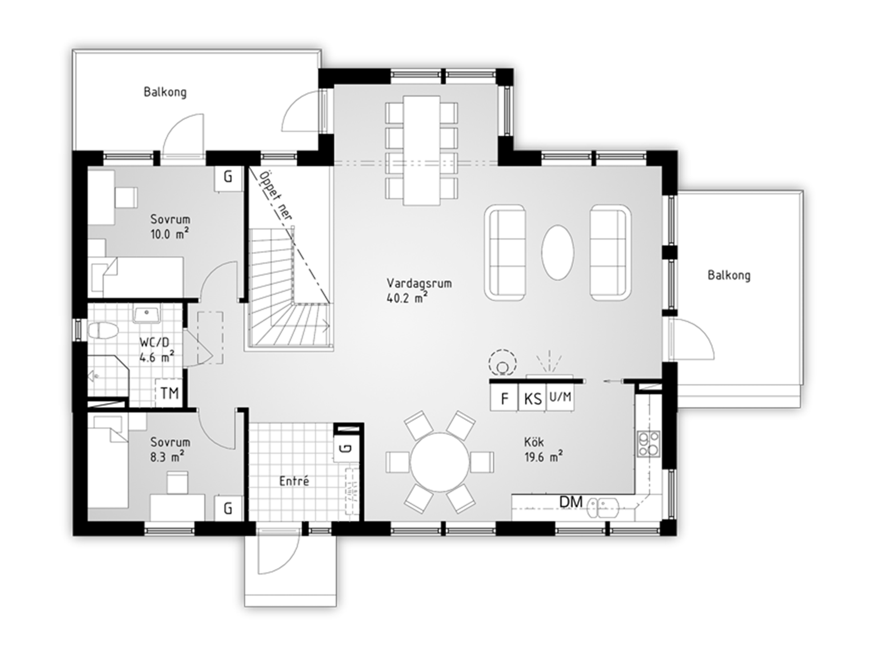 Har entrén på övervåningen som leder rakt in i det stora vistelserummet med kök, vardagsrum och matplats. Halvväggarna framför trappan bidrar med fria siktlinjer och gör att blicken kan vila långt utanför huset. Balkongerna är generösa och vänder sig åt flera väderstreck.