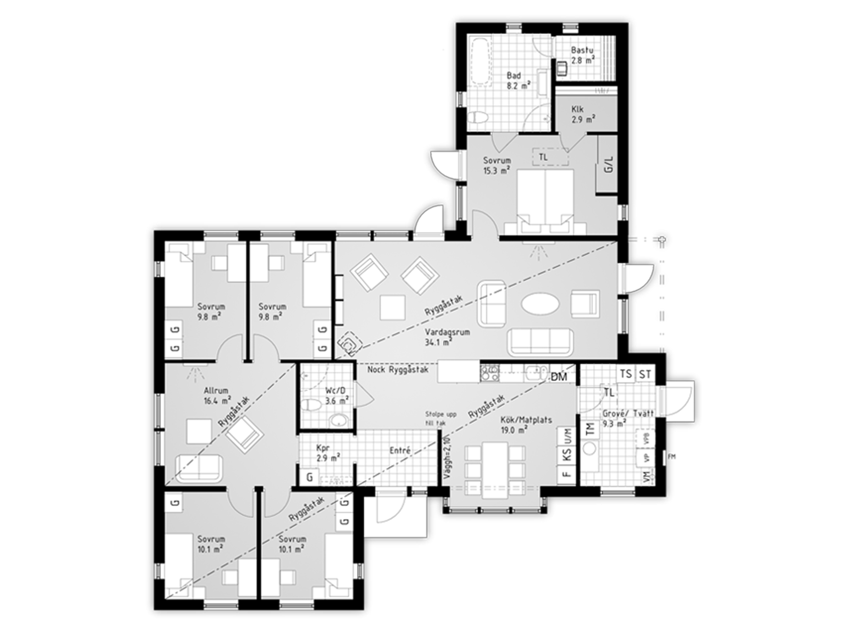 Ett riktigt masterbedroom med generöst tilltagen yta och egen badavdelning med plats för hörnbadkar, dusch och bastu. Barn/ungdomsavdelningen ligger avskilt, har fyra sovrum och ett eget allrum. Husets form ger möjlighet till skyddade uteplatser i flera väderstreck och du kan nå två av dem från vardagsrummet. Med 8 graders taklutning och plåttak får detta 1-planshus ett mer modernt uttryck.