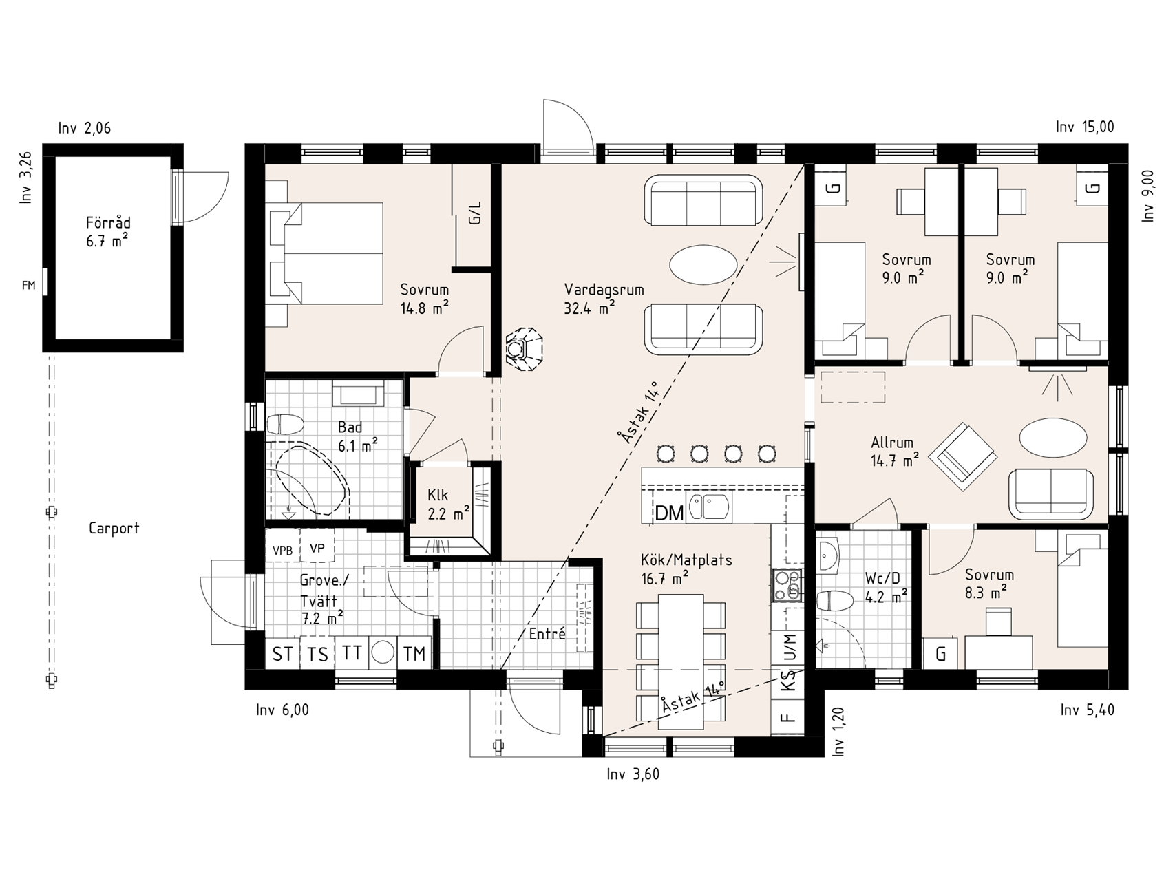 Planlösningen är smart uppdelad i en avskild barndel med ett tillhörande allrum medan föräldradelen ligger i andra änden av huset. Köket och vardagsrummet får en ännu rymligare känsla tack vare ryggåstaket som i sin högsta del når nära fem meter. Badrummet kan utrustas med jacuzzi och som ett alternativ kan du bygga om den intilliggande klädkammaren till en bastu.