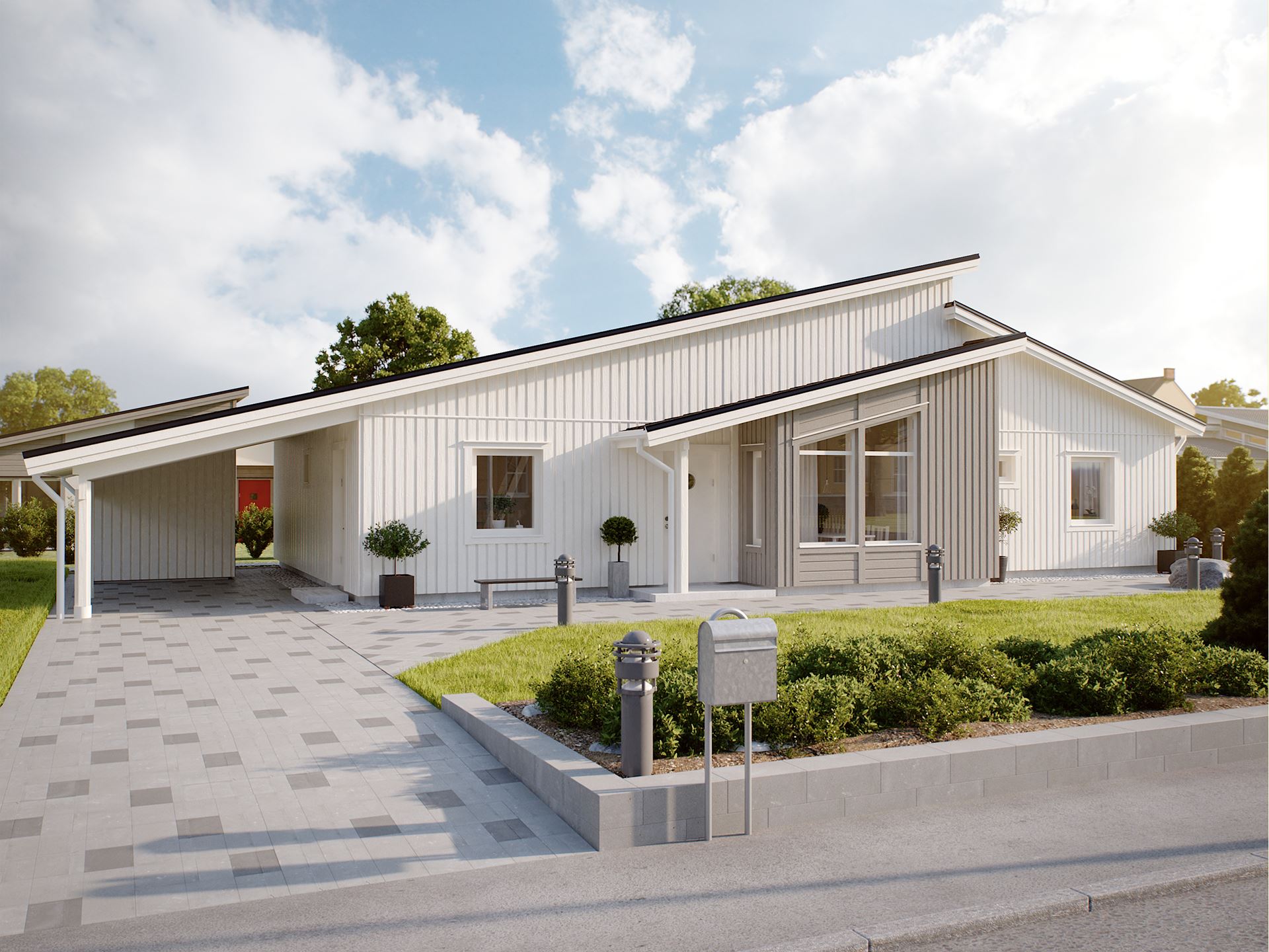 En modern villa med stora ytor och högt i tak. Estetiskt har huset inspirerats av nyfunkis som du bland annat märker på pulpettaket med integrerad carport och fasaden som mixar stående och liggande träpanel.