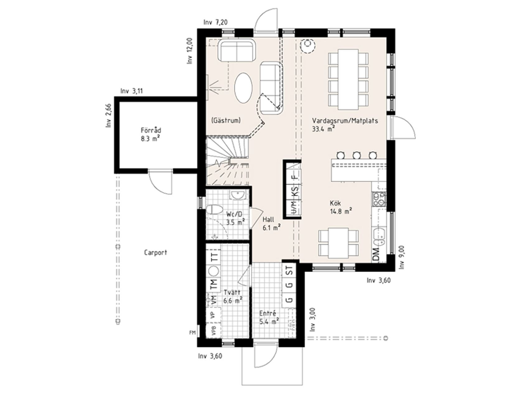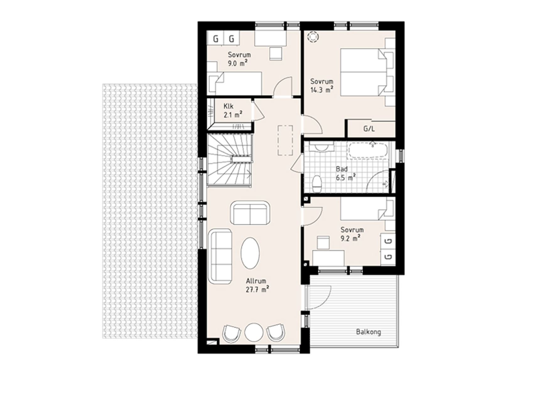 Uthamra är ett hus som passar även på små tomter. Entrén är praktisk belägen vägg i vägg med tvättstugan och ger samtidigt fri sikt in till hallen och vardagsrummet. Stora fönsterpartier ger huset en påtaglig känsla av ljus och rymd. Kök och vardagsrum ligger i direkt anslutning till varandra med utsikt mot både gatan och trädgården. Du som vill kan dela av planlösningen i ett extra sovrum eller arbetsrum vid trappan.
