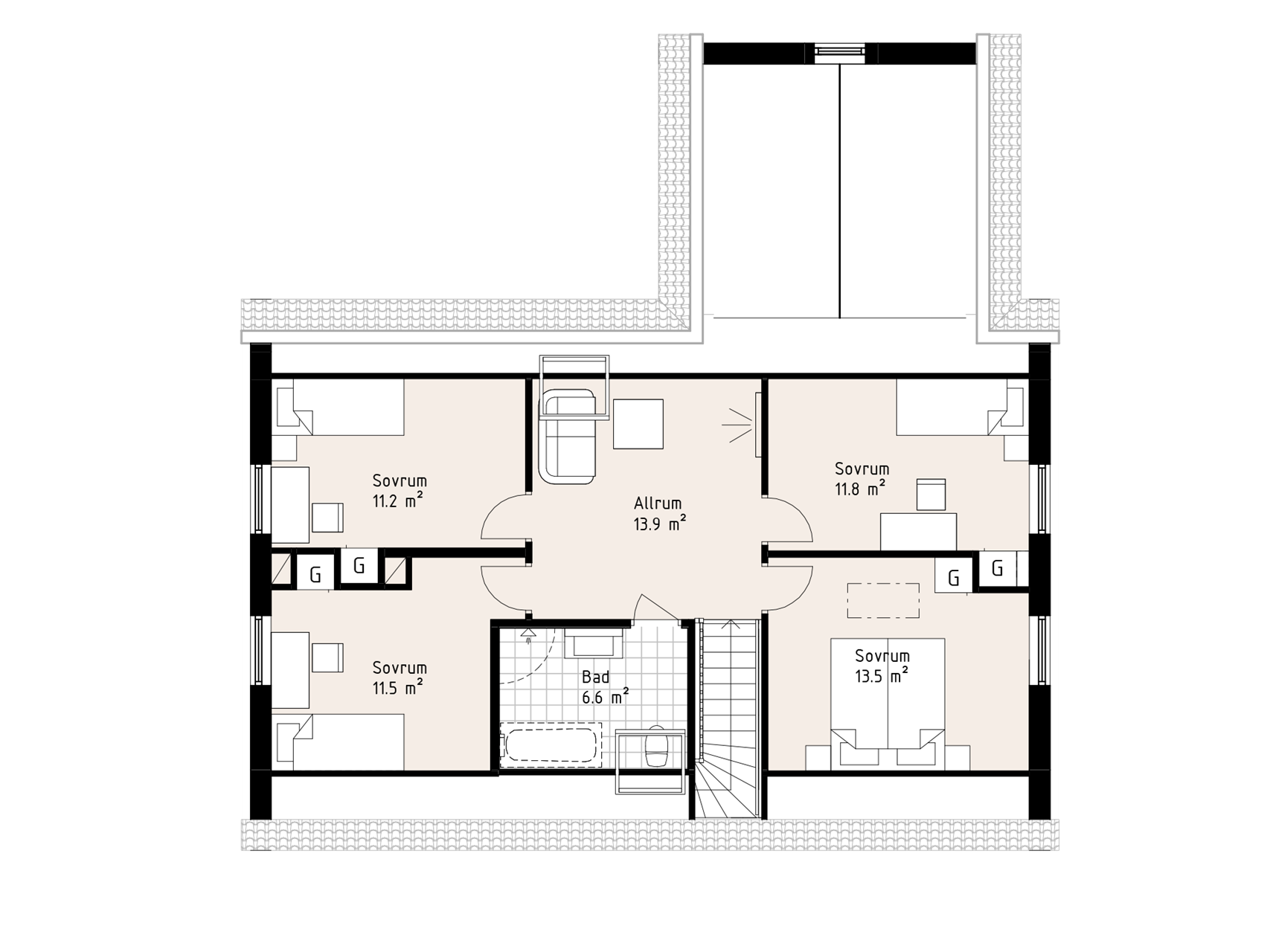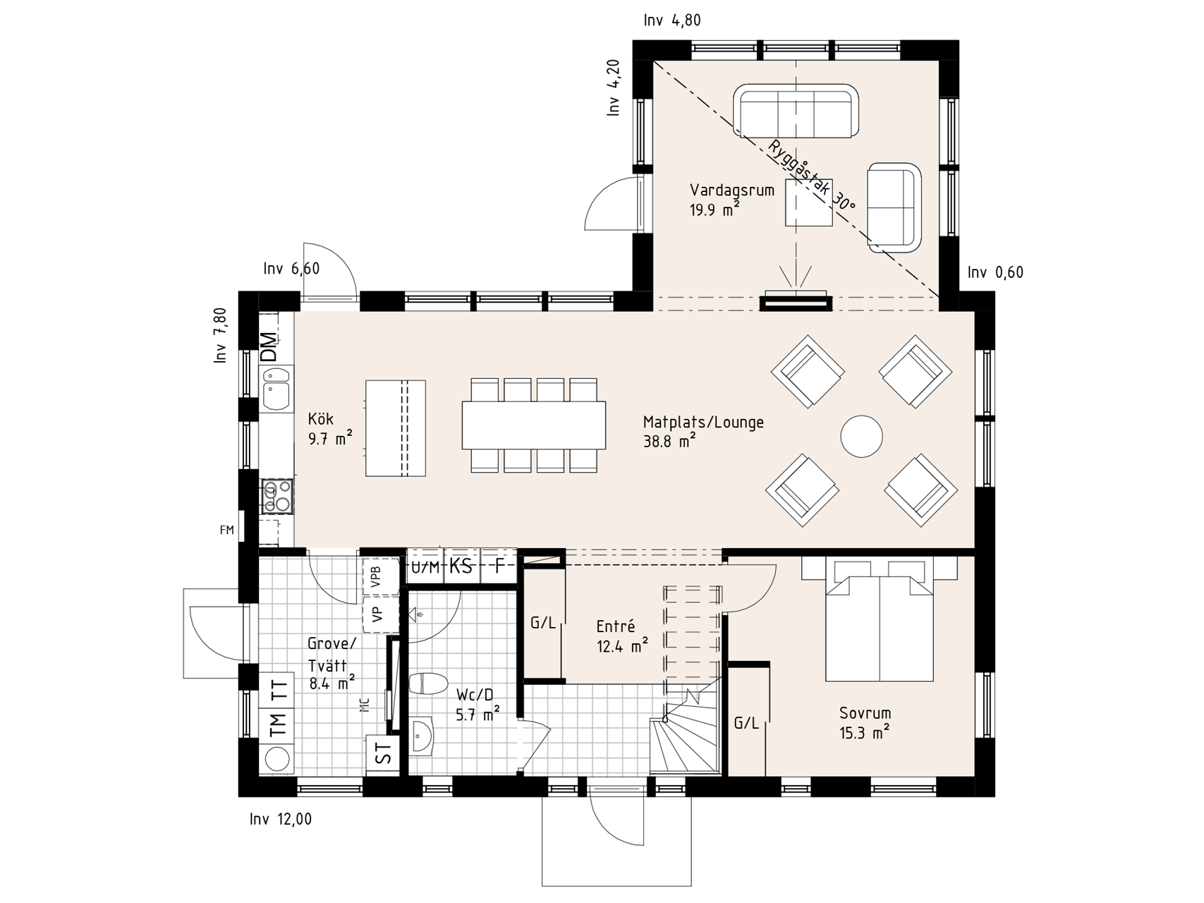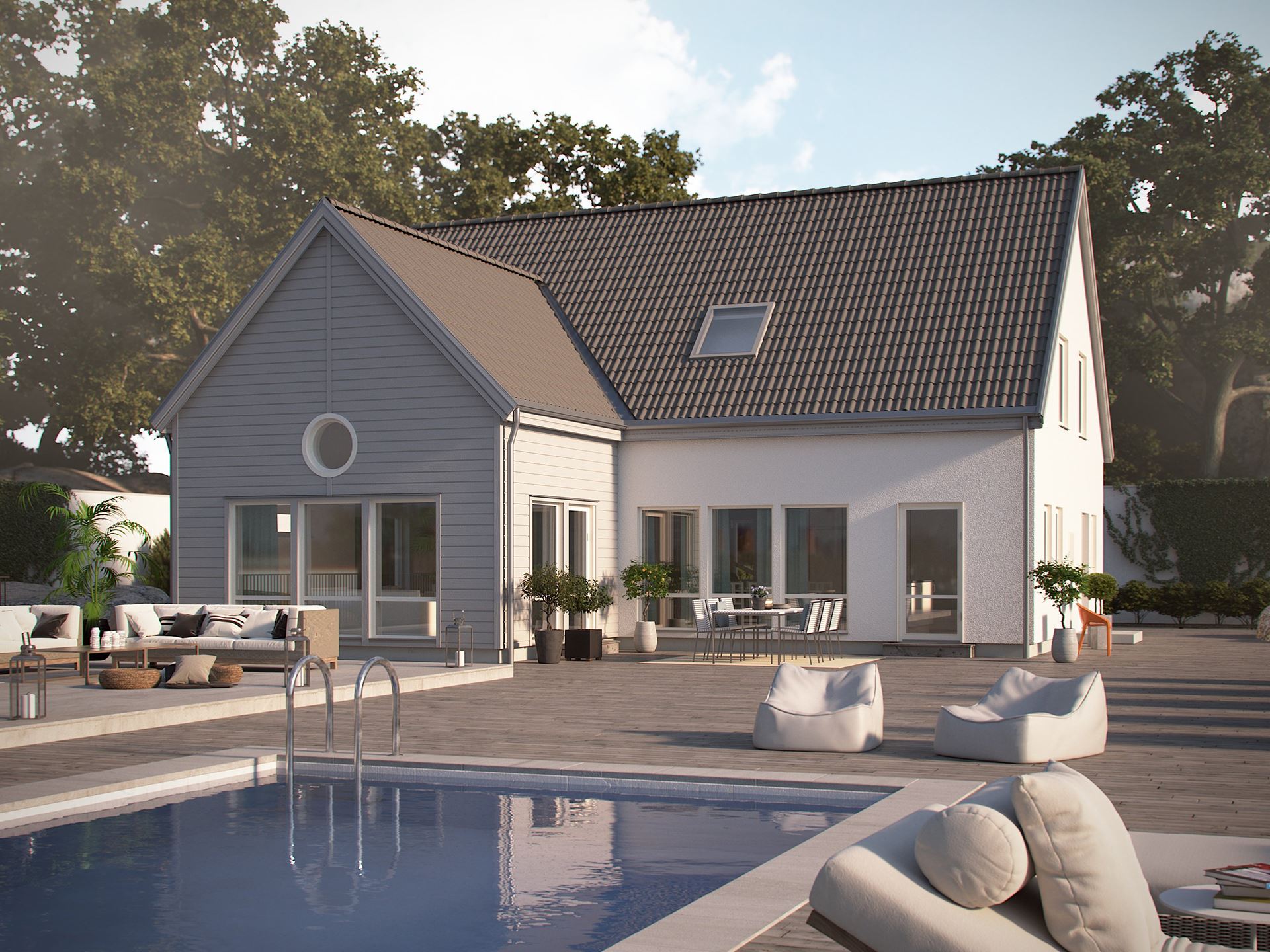 När du öppnar dörren möts du av ett ganska öppet entréplan, men allt flyter inte ihop. Matplatsen och köket separeras med en köksö och vardagsrummet bryter av med ett ryggåstak i vinkel. Huset är klassiskt, men jag har valt en kort takfot för att få det att kännas mer resligt samtidigt som fönsterplaceringen och fasaden gör sitt för en mer modern känsla.