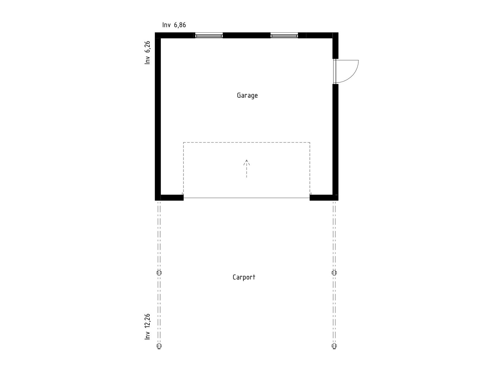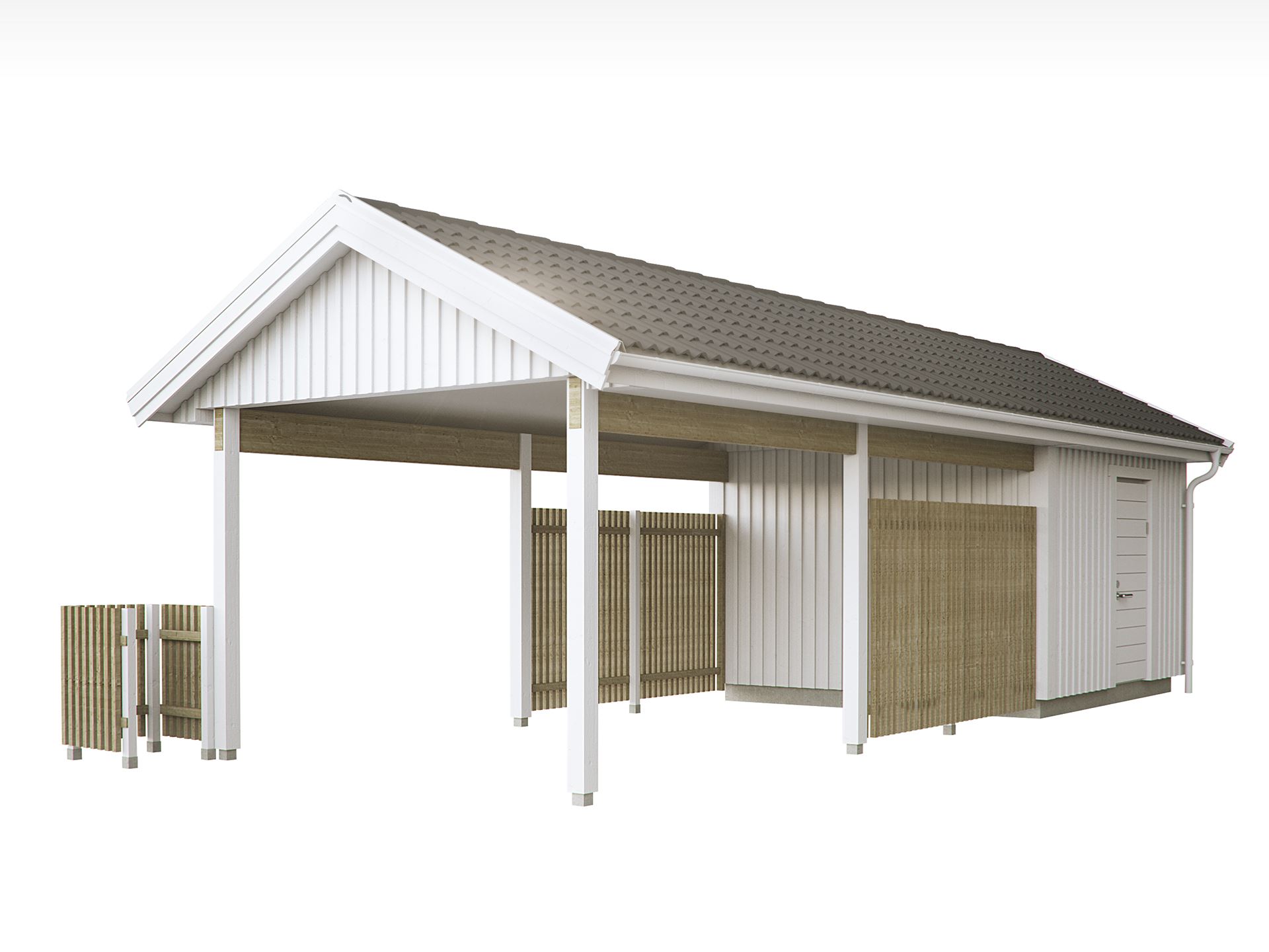 Smidigt alternativ med kombinerad carport och förråd. En bredd på 3,26 meter ger plats för en bil i carportdelen, och i förrådsdelen har du 10,6 m² att organisera dina saker på. Eller att sprida ut dem, förstås.