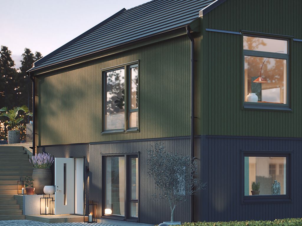 I modern stil får Dagsmeja en stilren gestaltning som skapar ett distinkt uttryck. Här ser vi en tvåtonad färgsättning med mörk sockel och en skogsgrön fasad, perfekt kompletterat av ett svart tak. Även de stora rena fönsterytorna förstärker den nutida känslan. Inne möter ute i en sömlös helhet.