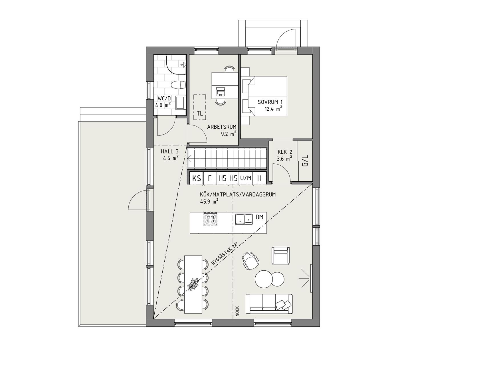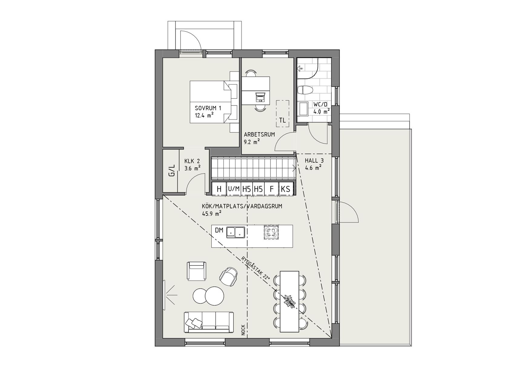 Dagsmeja är ett hus med resurser. Ett gavelställt suterränghus – eller sluttningshus – i stilren design som både bjuder på generösa sällskapsytor, gott om förvaring och fem sovrum fördelat på två våningar. Det sistnämnda skapar också stora möjligheter att låta rummens funktion ändras med tiden.