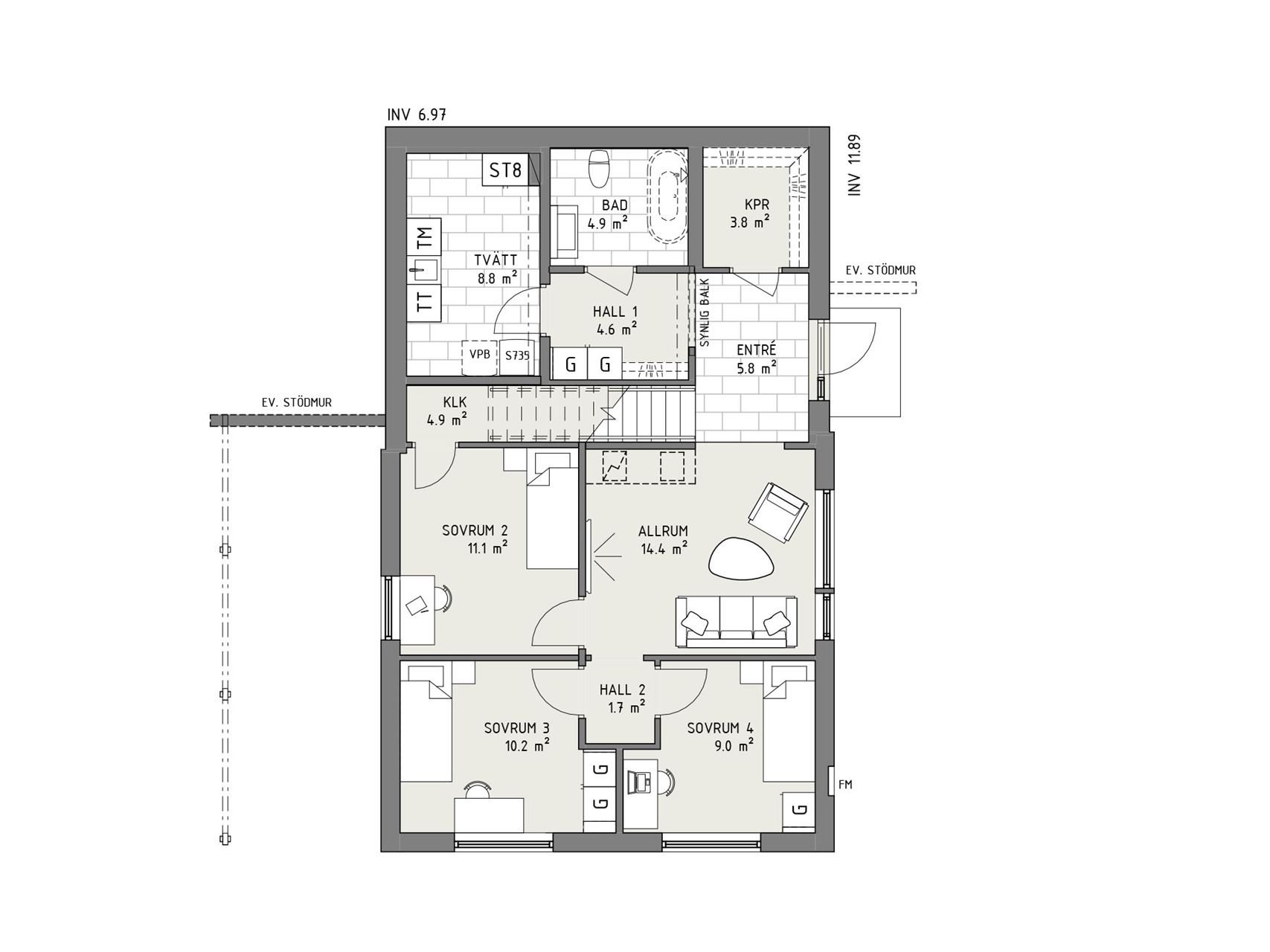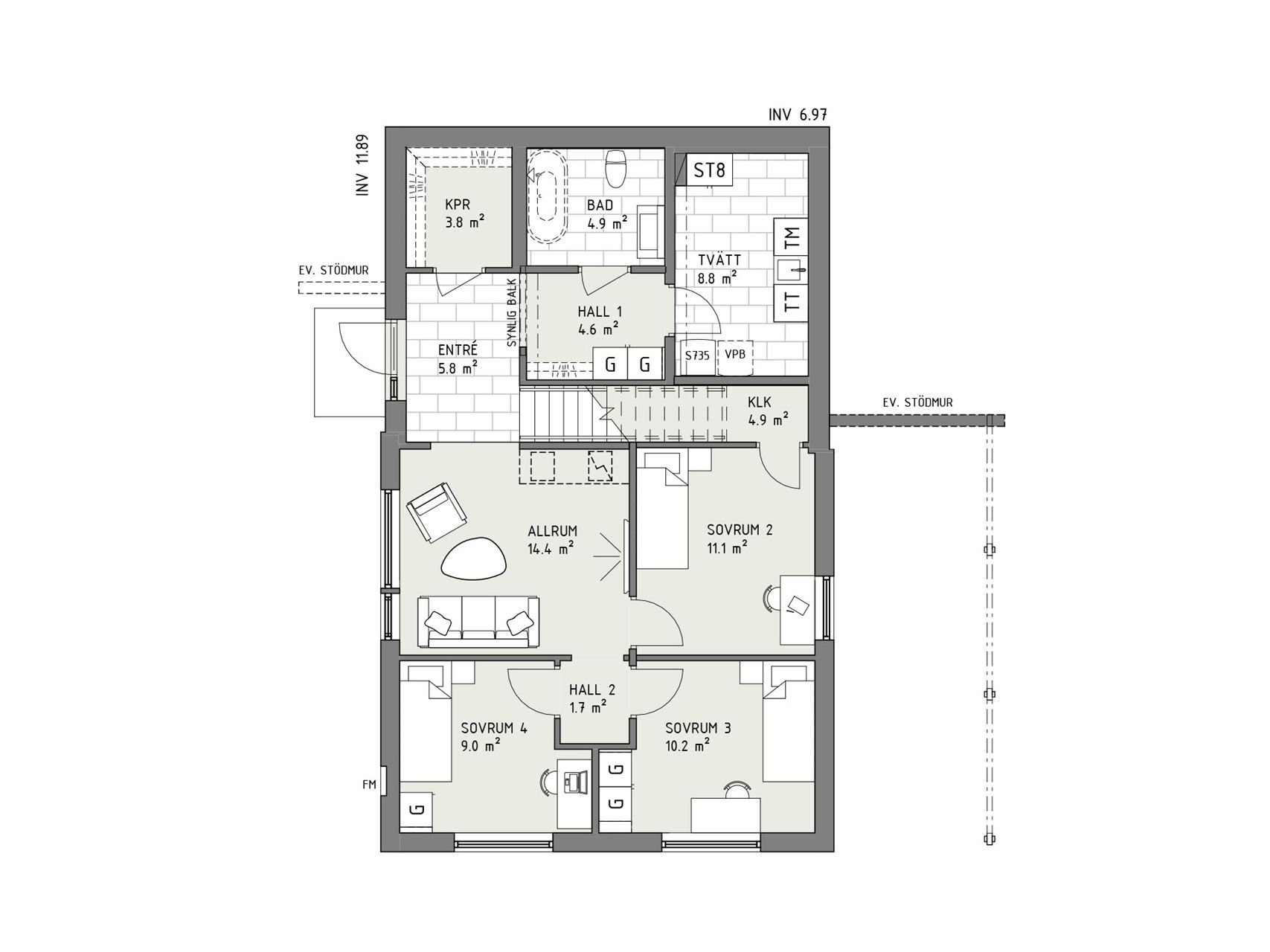 I Dagsmeja gör du entré på en sluttningsvåning som rymmer allt det praktiska – som tvättstuga, badrum och gott om förvaring. Här finns också tre sovrum och ett trevligt allrum som har ett generöst ljusinsläpp, vilket garanterar noll källarkänsla. Den raka trappan ger i sin tur en fin koppling till övervåningen och allt det goda som väntar där uppe