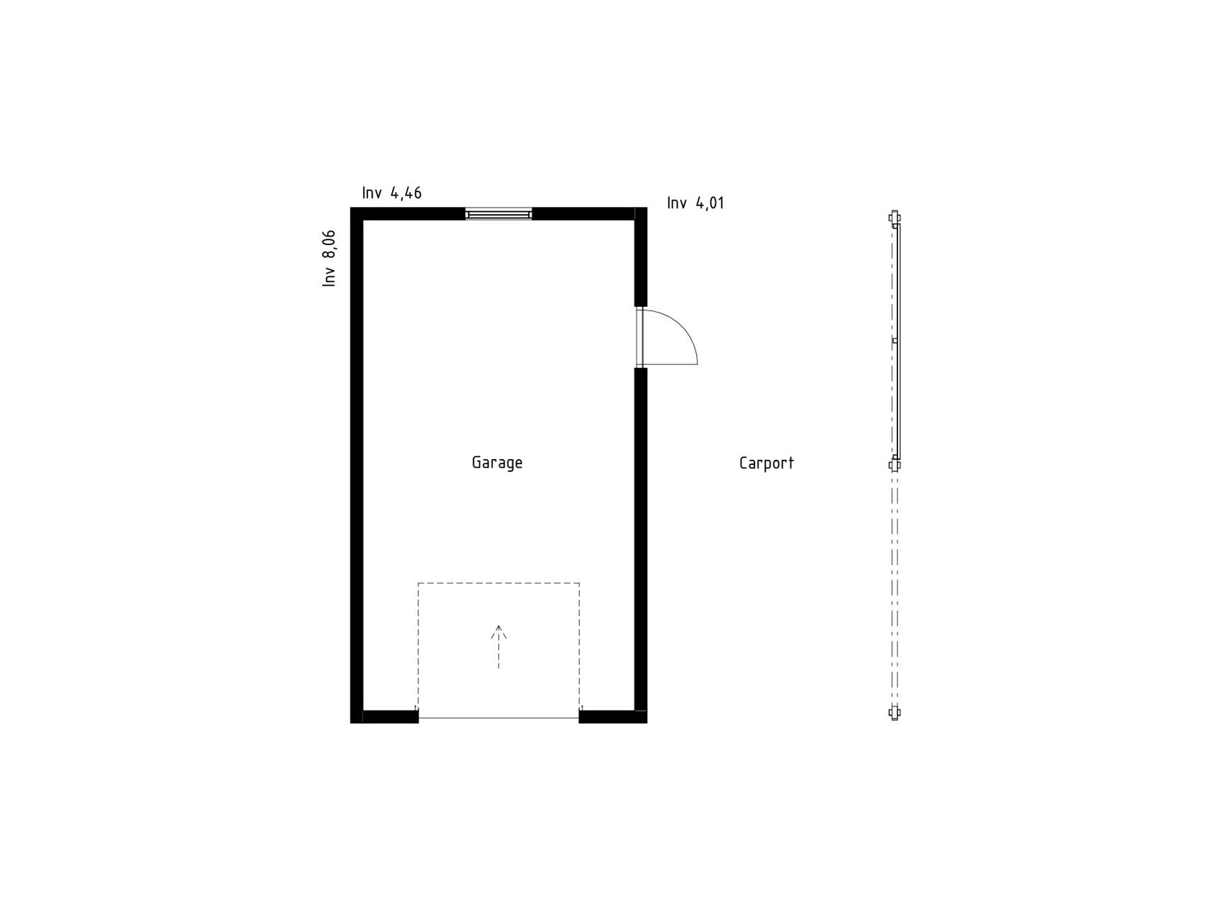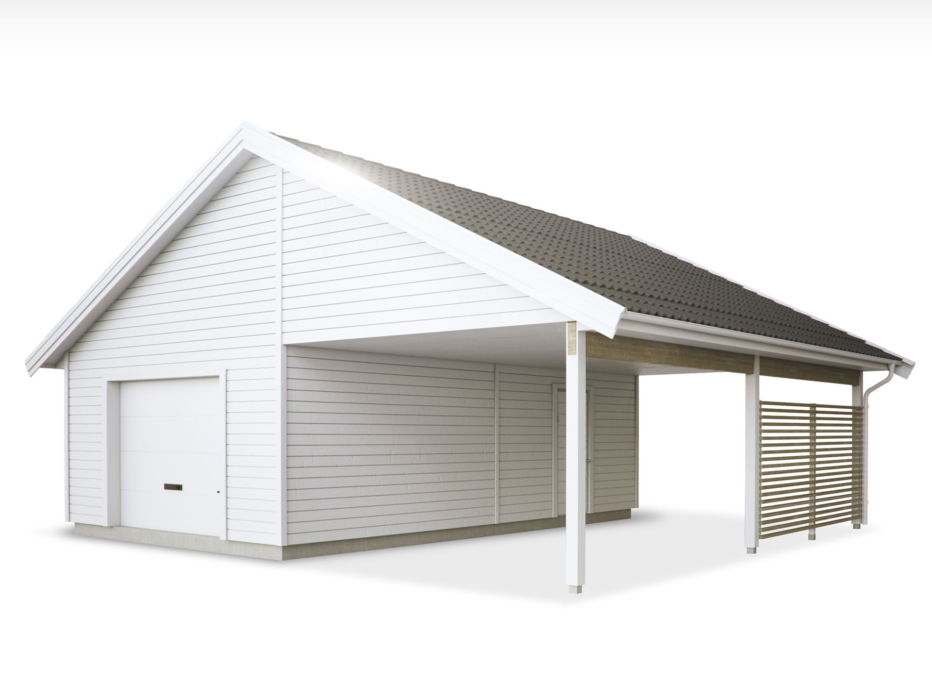 Garage och carport under samma tak. Garaget har plats för en bil, men kan förstås lika gärna användas som hobbyrum. Här finns separat entrédörr i den bakre delen. Carporten rymmer också en bil. Och tack vare byggnadens generösa djup finns här även gott om plats för cyklar och annat.