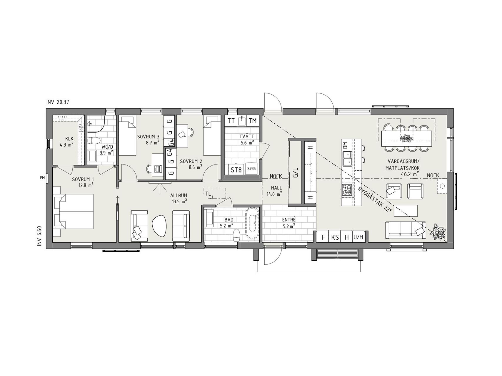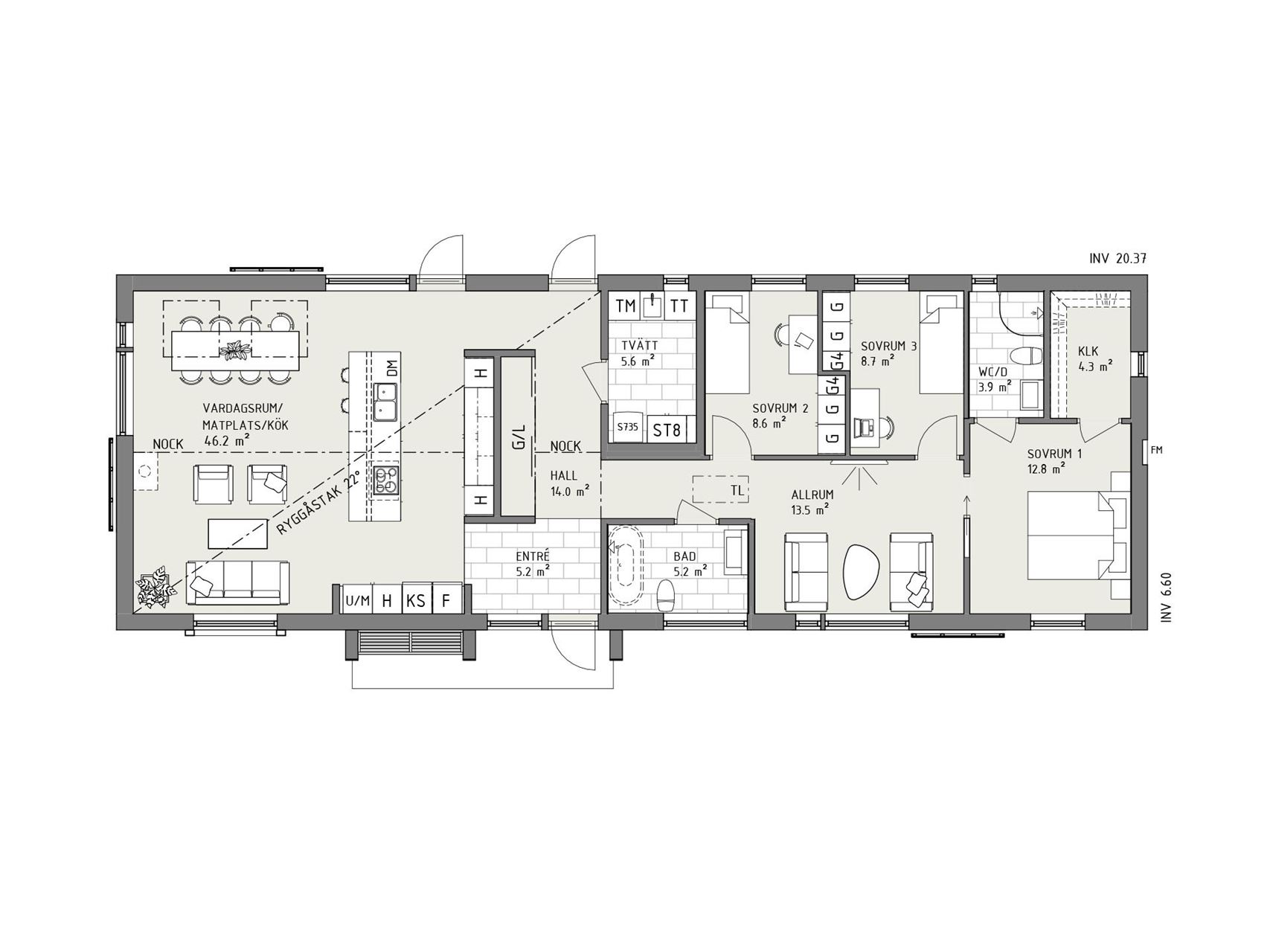 I Gryning binds det offentliga rummet på framsidan av huset samman med det mer privata på baksidan via entrén, där du har en fri siktlinje ut mot altandörren. Huset är indelat i två olika zoner, en privat och en gemensam. I den privata finns de tre sovrummen, ett extra allrum, badrum, klädkammare och tvättstuga. I den andra delen av huset samspelar kök och vardagsrum i en fin öppen planlösning.
