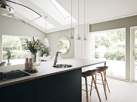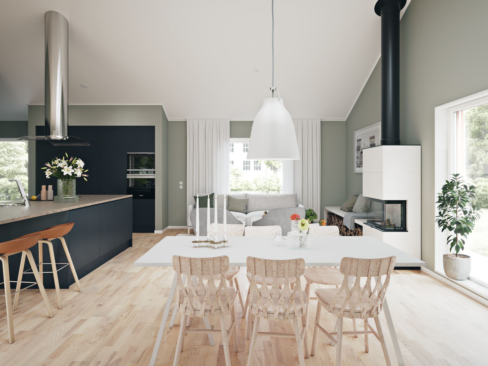 I det integrerade studioköket, som är husets hjärta, spelar köksön en central roll. Den är placerad i mitten av rummet och bidrar till ett härligt flöde. I allrummet, där du även har möjlighet att öppna upp i nock, möts du av den öppna spisen och ett stort fönsterparti i gavelväggen. Det ger en fin rymd till rummet och bjuder in trädgården till husets insida.