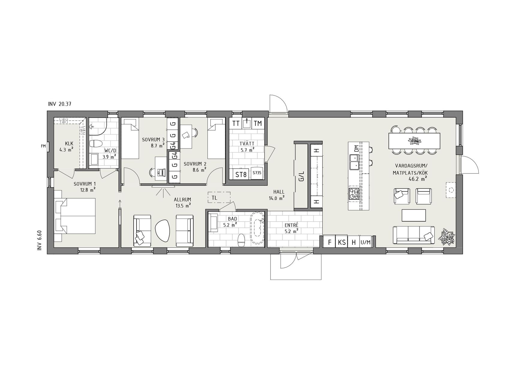 I Gryning binds det offentliga rummet på framsidan av huset samman med det mer privata på baksidan via entrén, där du har en fri siktlinje ut mot altandörren. Huset är indelat i två olika zoner, en privat och en gemensam. I den privata finns de tre sovrummen, ett extra allrum, badrum, klädkammare och tvättstuga. I den andra delen av huset samspelar kök och vardagsrum i en fin öppen planlösning.