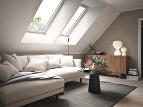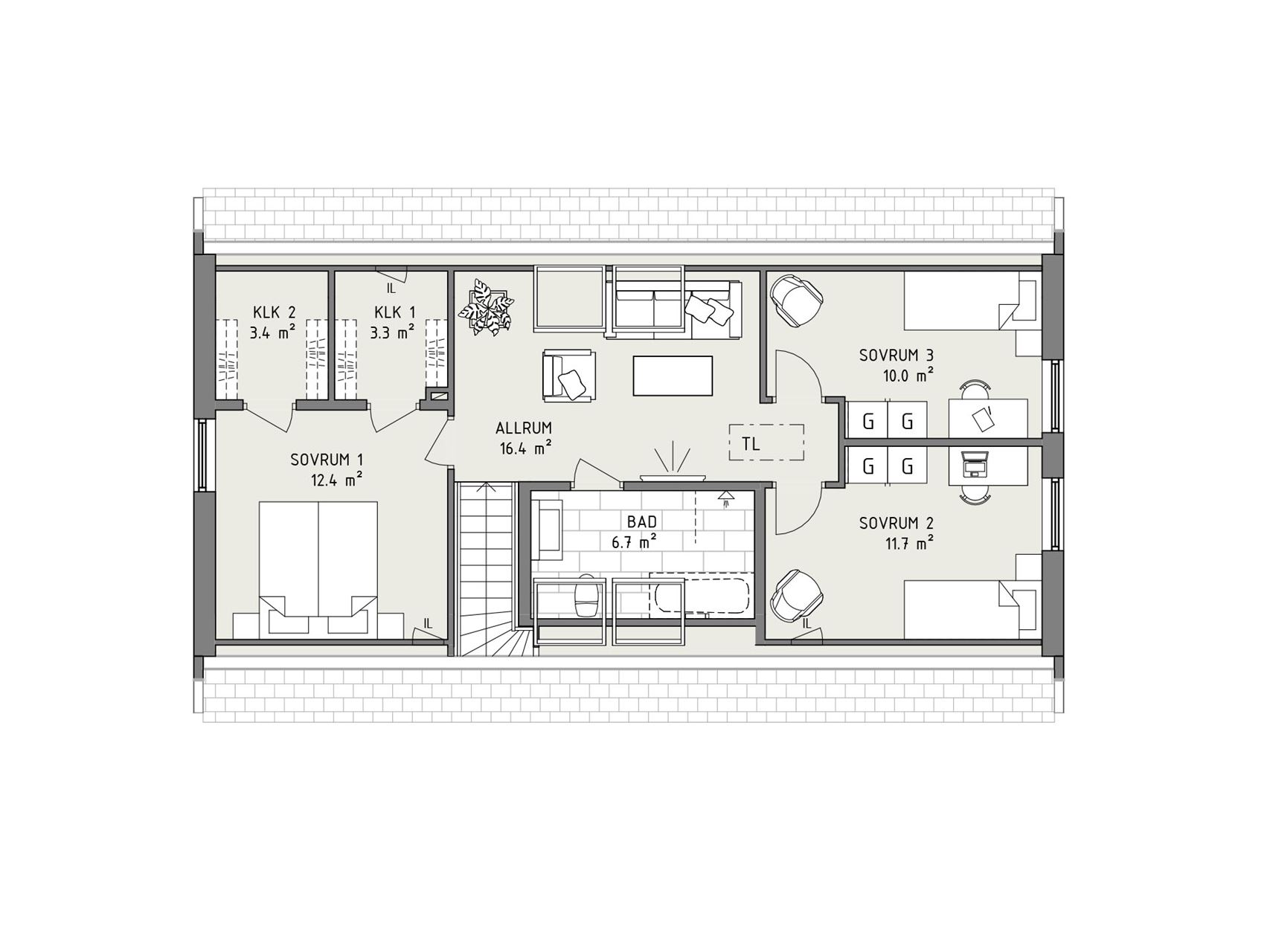 En trappa upp fortsätter ljusinsläppet att dominera, inte minst tack vare två generösa takfönster i allrummet. Här finns också två barnsovrum och ett större föräldrasovrum med två separata klädkammare, liksom ett badrum med både dusch och badkar.