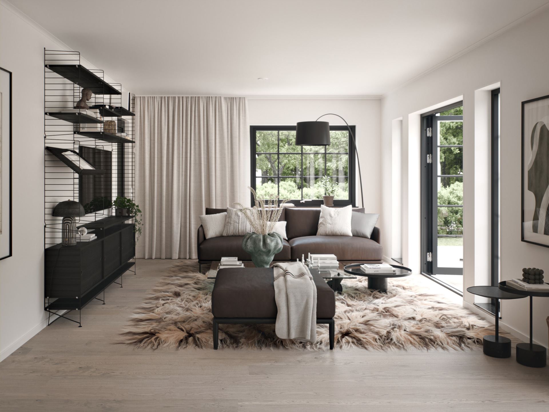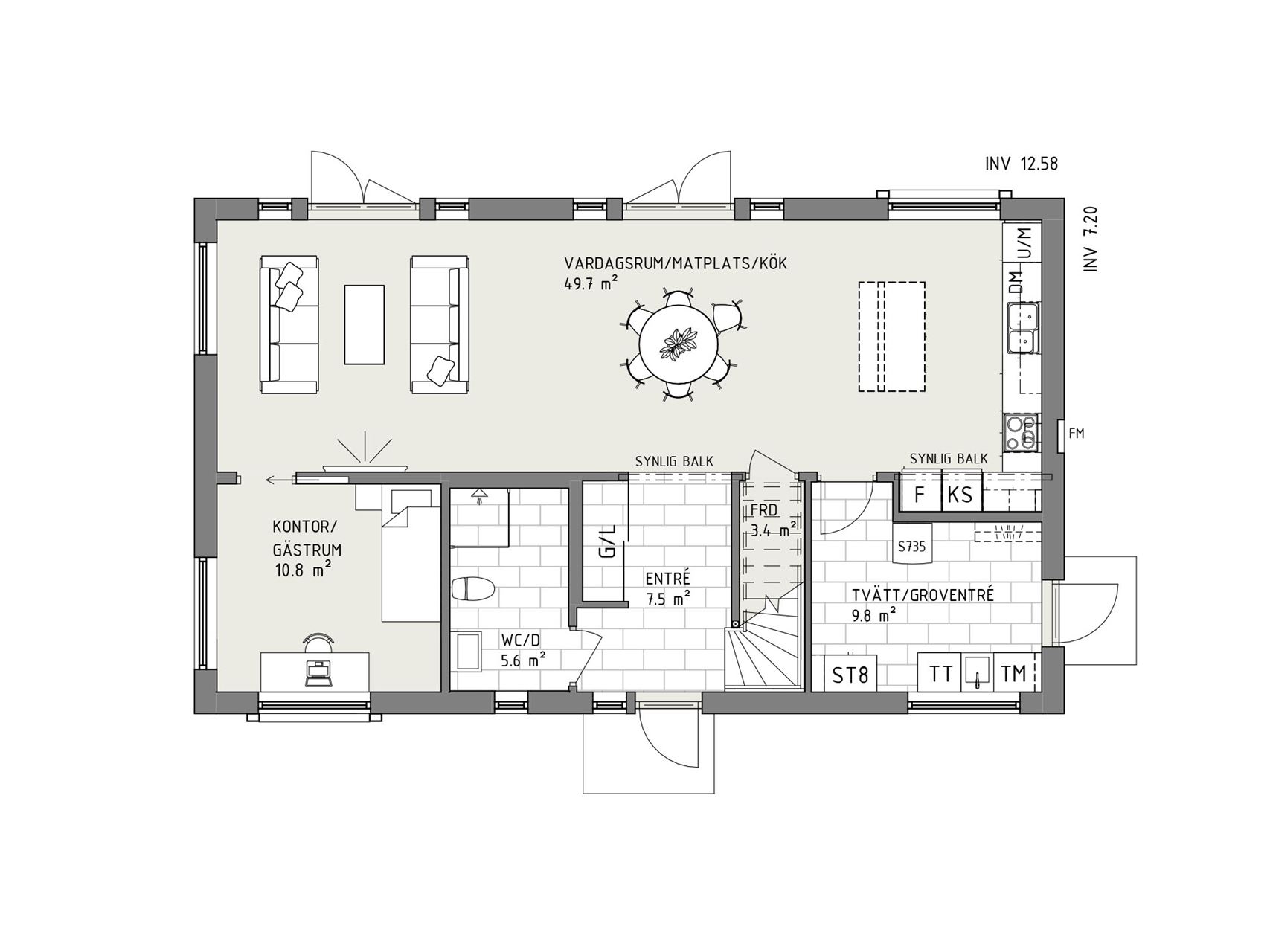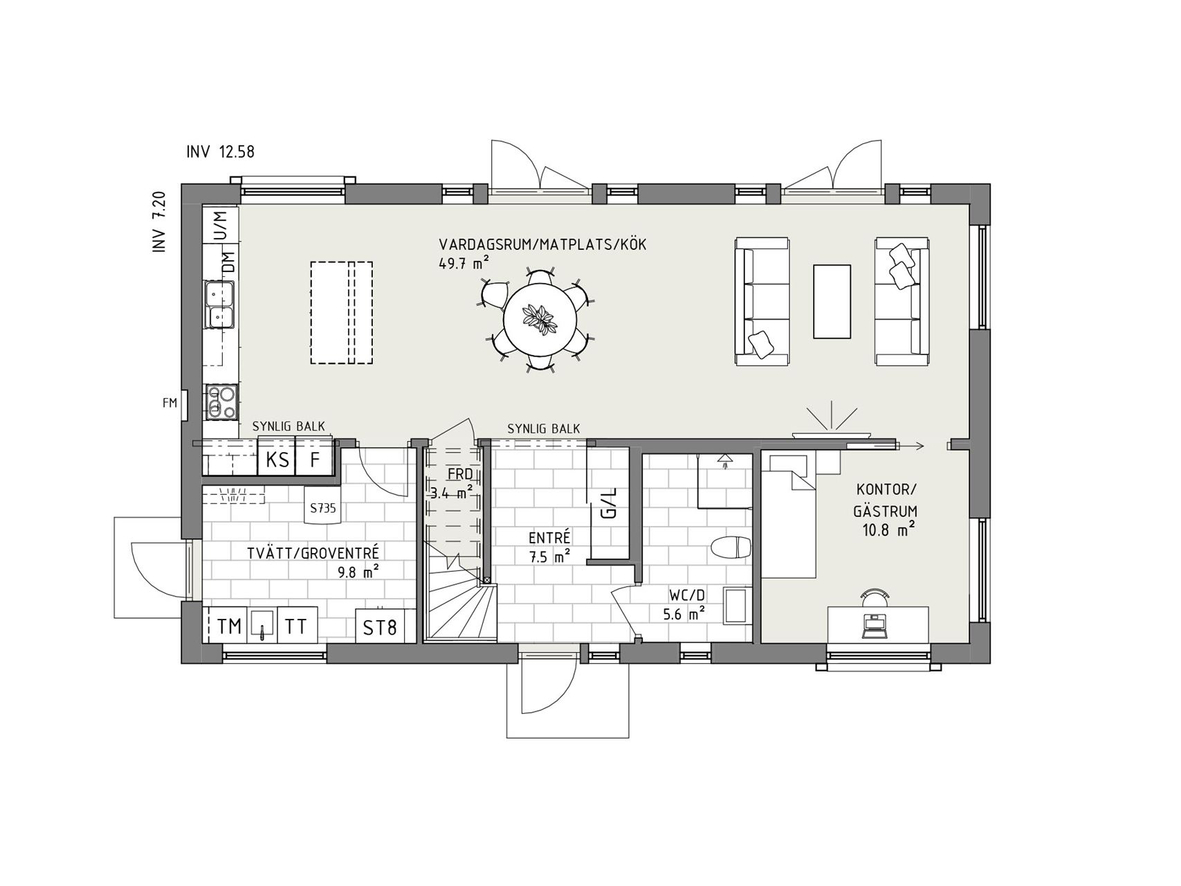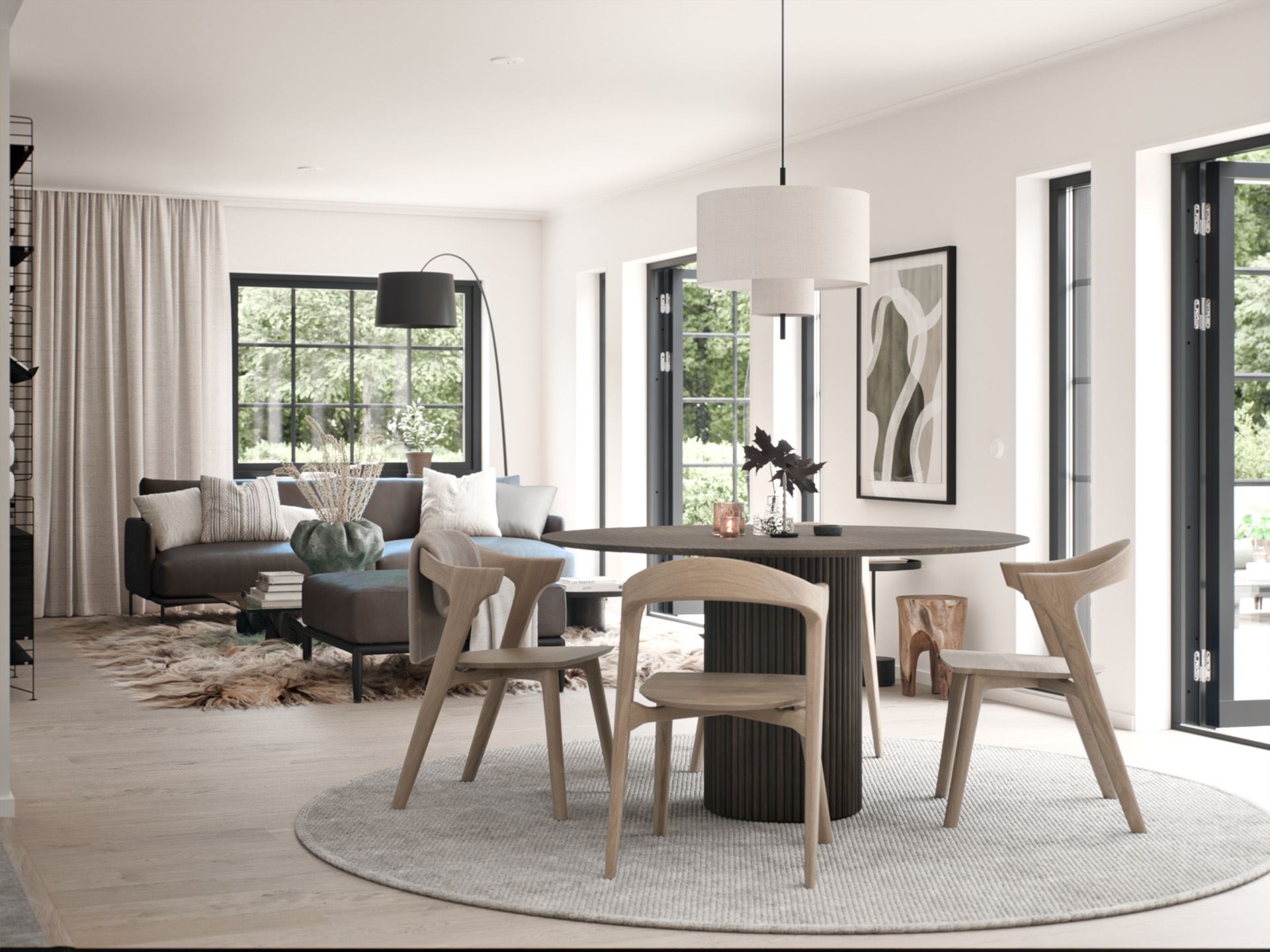Direkt i entrén möts du av ett härligt ljusinsläpp och fint siktdjup. Husets umgängesytor är generösa. Kök, matplats och vardagsrum ligger i fil och upptar hela husets ena långsida – som flödar av ljus från stora fönsterpartier. I vinkel med vardagsrummet ligger husets kontor eller gästrum, som även kan integreras som en del av ett större vardagsrum om ni så önskar.