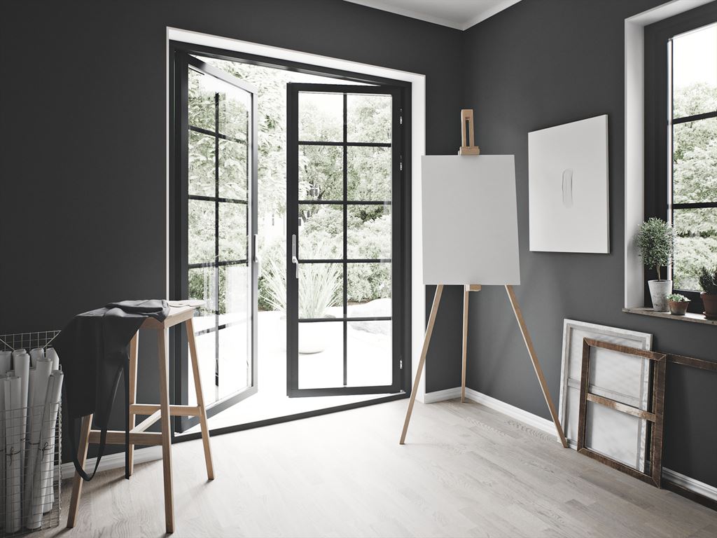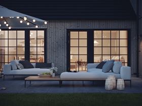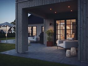 Den här stilen är utformad med stående funkispanel och svarta småspröjsade fönster i en generös fönstersättning som låter ljuset flöda in. Kombinationen av de svarta industrifönstren och takpannorna i samma färg ger en vacker kontrast mot panelen. Detta sätter stilen för hela huset.