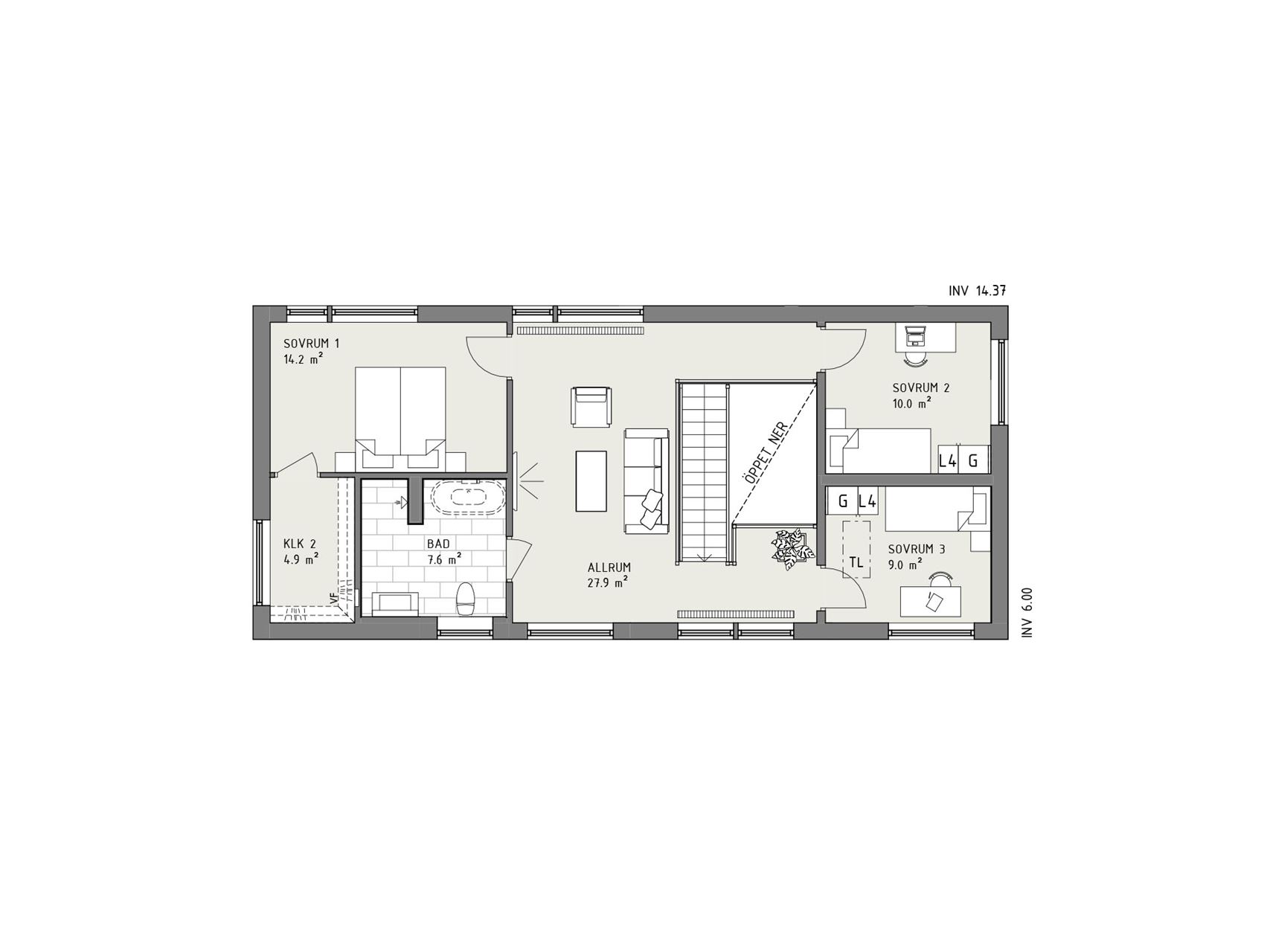 Kök och vardagsrum ligger avskilt från varandra, men knyts ihop via de generöst glasade ytorna i respektive rum – med siktlinjer sinsemellan för ett vackert samspel. Morgondagg är ett hus som släpper in naturen utanför och låter dig njuta av dess konstverk i varje rum. På entrévåningen finns även ett sovrum som fungerar fint som arbetsrum eller gästrum, toalett med dusch och en härligt praktisk tvättstuga med groventré. En trappa upp väntar husets mer privata del med ett ytterst trevligt allrum, ett stort badrum och tre sovrum.