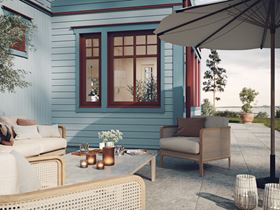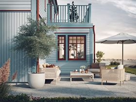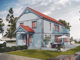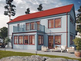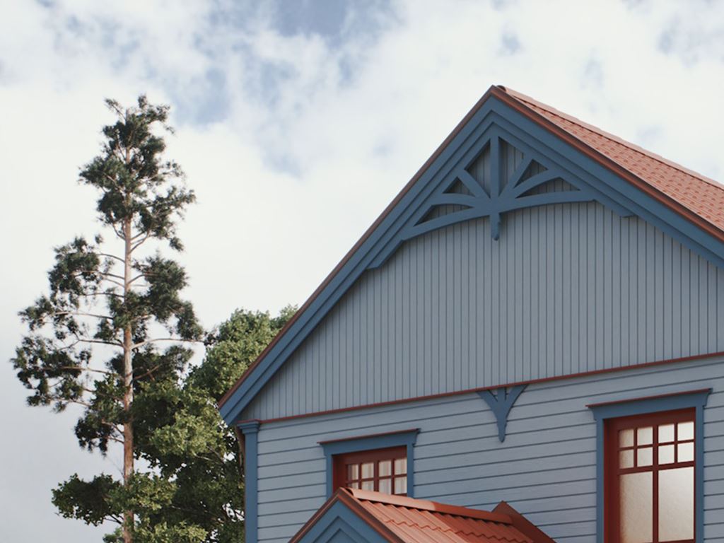 Morgonstjärna i sekelskiftesstil bjuder på en vacker entréveranda och utsmyckningar som förstärker den välkomnande känslan som följer stilen. En pastellfärgad fasad med omväxlande stående och liggande panel är också typisk för stilen tillsammans med en stark röd kulör på dörrar och fönsterkarmar – och vackert spröjsade fönster, såklart.
