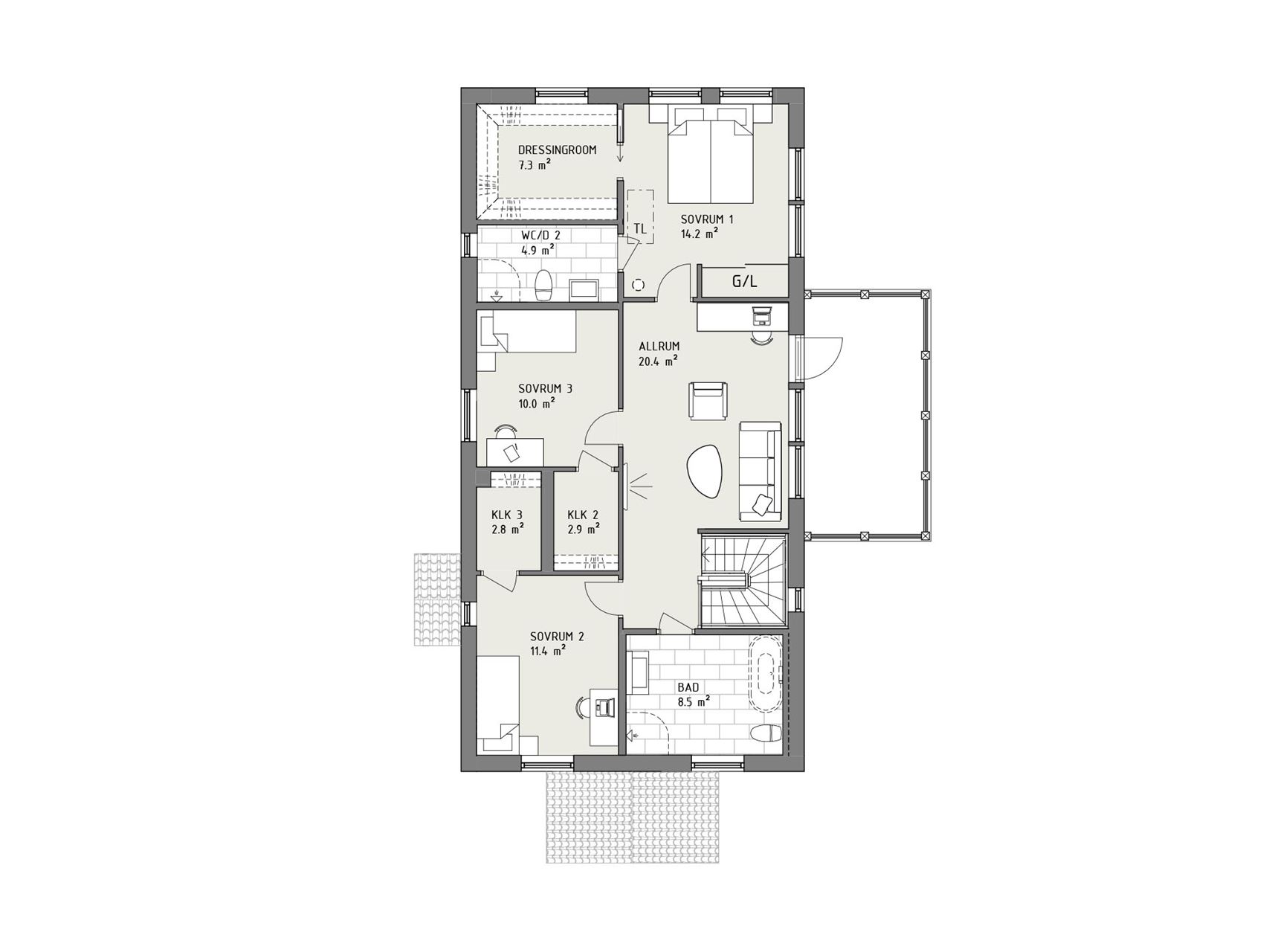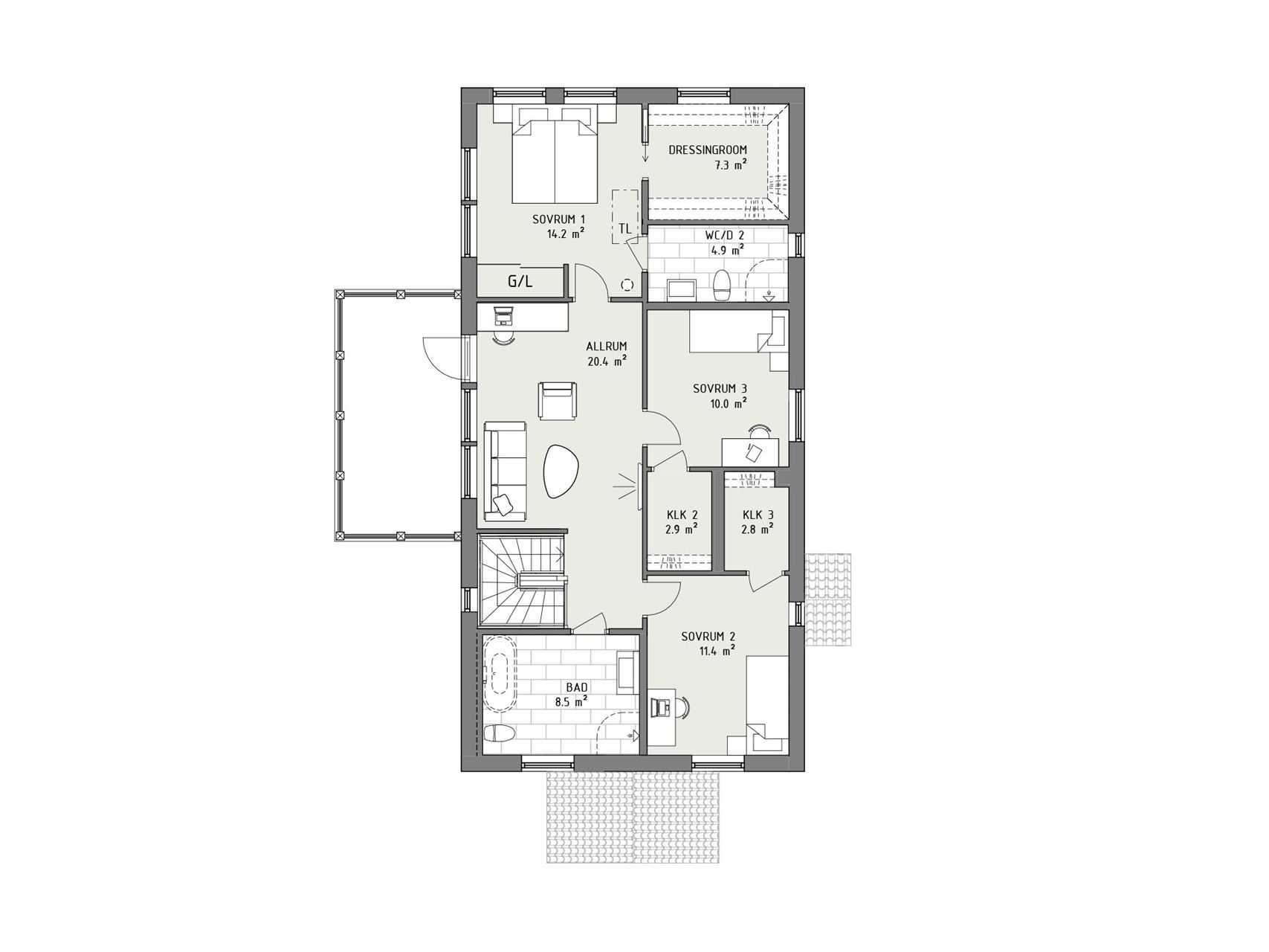 På övervåningen har familjen gott om rum för privatlivet. Här finns ett stort allrum, eller ett jättestort sådant, beroende på vilken av husets stilar du väljer. Men också ett generöst badrum, gott om förvaring och tre rymliga sovrum. Master bedroom kan dessutom skryta med eget dressingroom – och egen toalett med dusch.