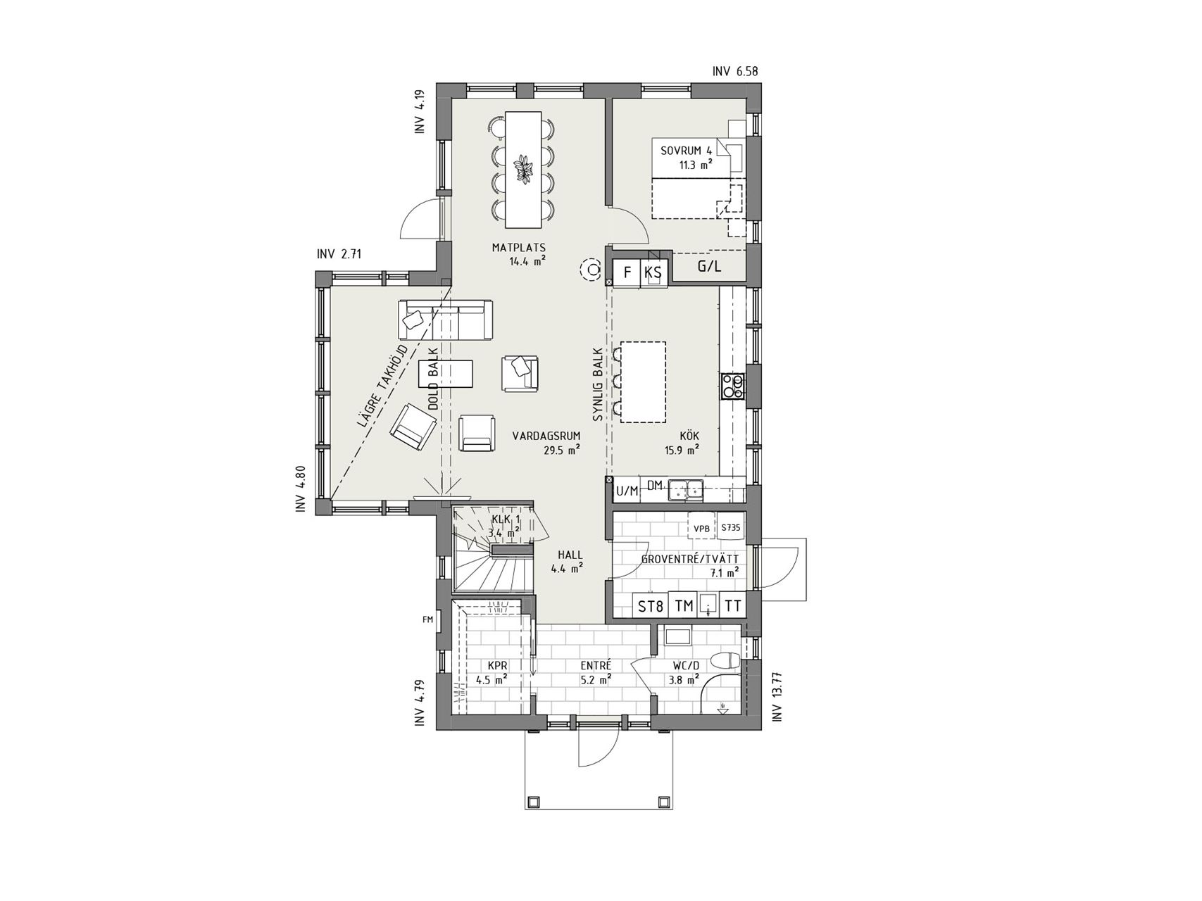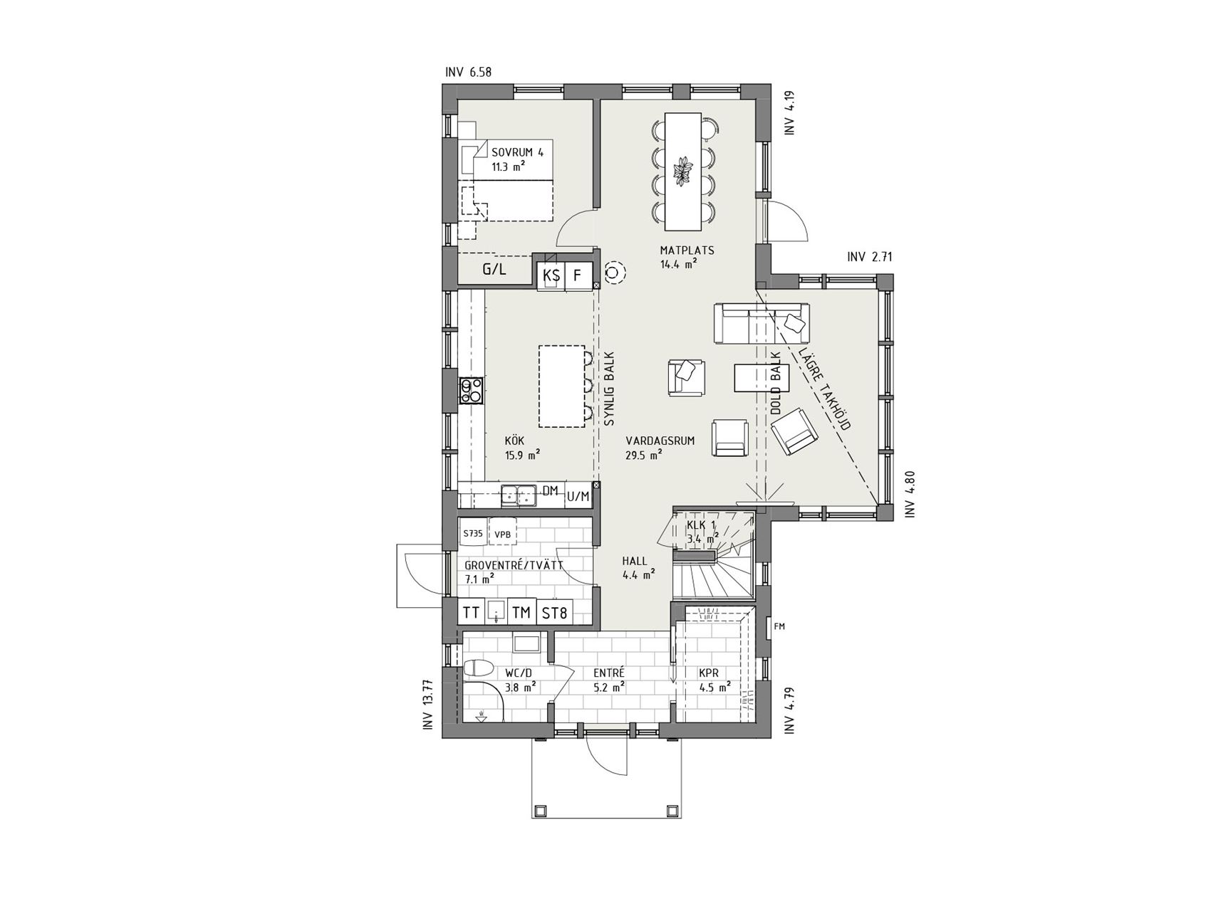 Från entrén har du en inbjudande siktlinje rakt igenom hela huset. Här finns gott om praktiska fördelar, som ett rymligt kapprum, toalett med dusch och tvättstuga med groventré. Ett par steg längre in öppnar sig en imponerande yta rum med kök och vardagsrum på varsin sida. Vardagsrummet skjuter ut ur fasaden som ett burspråk och har generöst med fönster runt om. Från matplatsen når du också ett trevligt sovrum, eller kanske ditt hemmakontor?