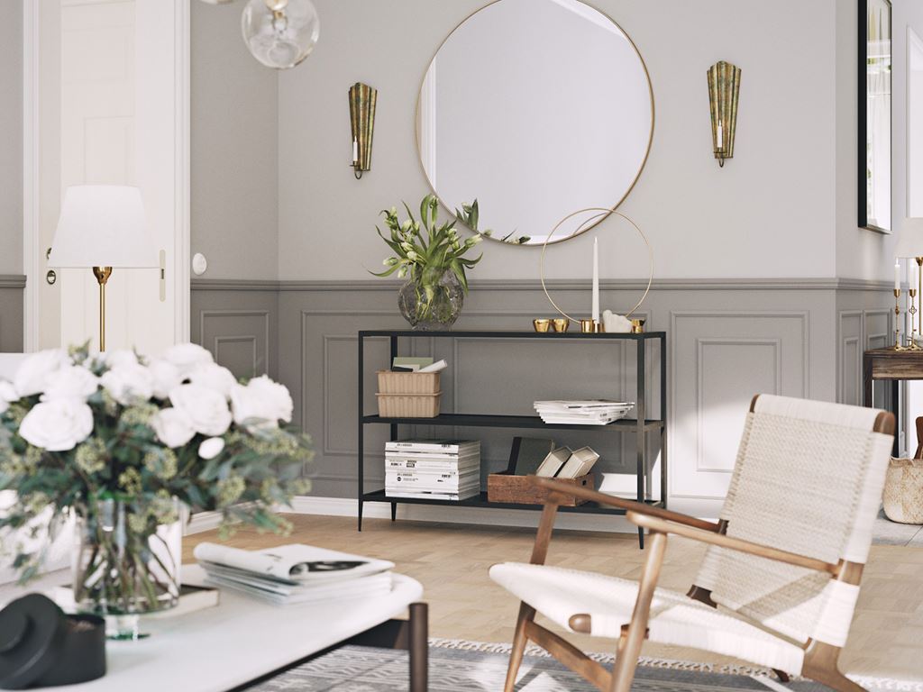 I den rymliga entrén välkomnas du med fri sikt rakt igenom huset. Ryggåstaket ger en härlig rymd och i hallen silar ljuset ner från halvmånefönstret i nock. Från det luftiga vardagsrummet har du fin kontakt med köket via en öppen bardel – och med trädgården genom de vackert spröjsade altandörrarna.